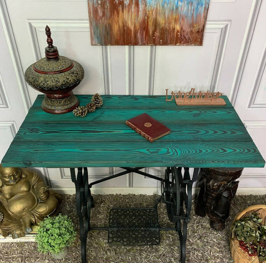Sewing Machine Table TV Stand Yakisugi Charred Wood Table Turquoise
