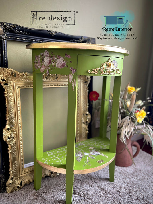 Upcycled Lime Green Console / Side Table with Raised Stencil & Gold Leaf Accents