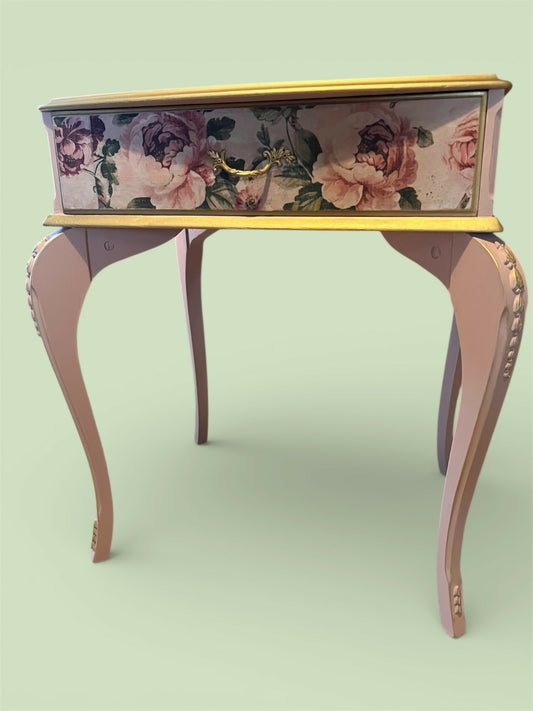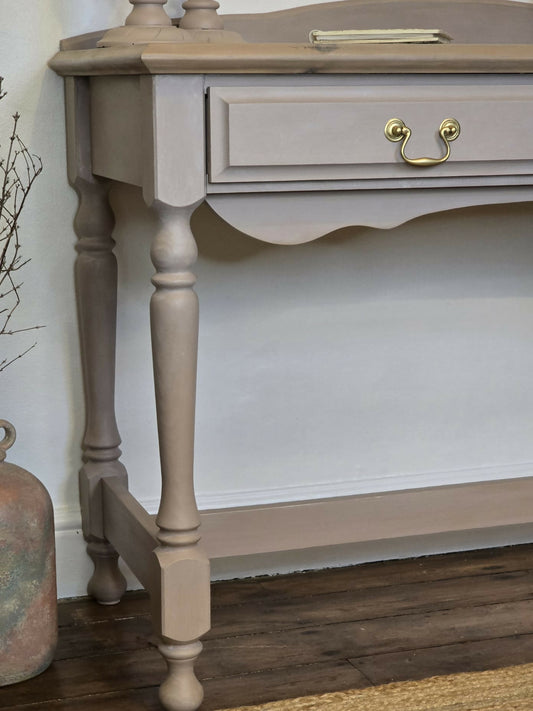 Vintage pink hand-painted solid pine console table, desk, dresser.