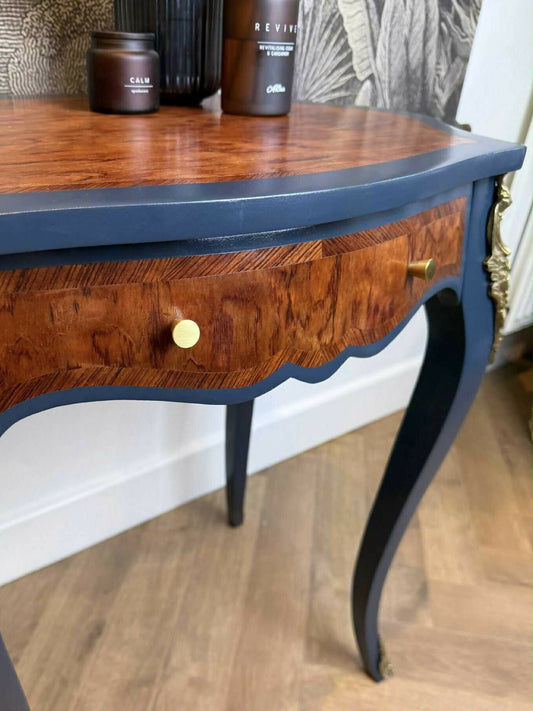 Vintage Console Table/ Side Table in Navy Blue, Gold & Wood with Antique Ornate Details