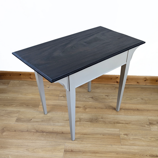 Vintage hallway table, console table, writing table with drawer. Solid wood painted neutral beige, metallic detailing & dark stained top.