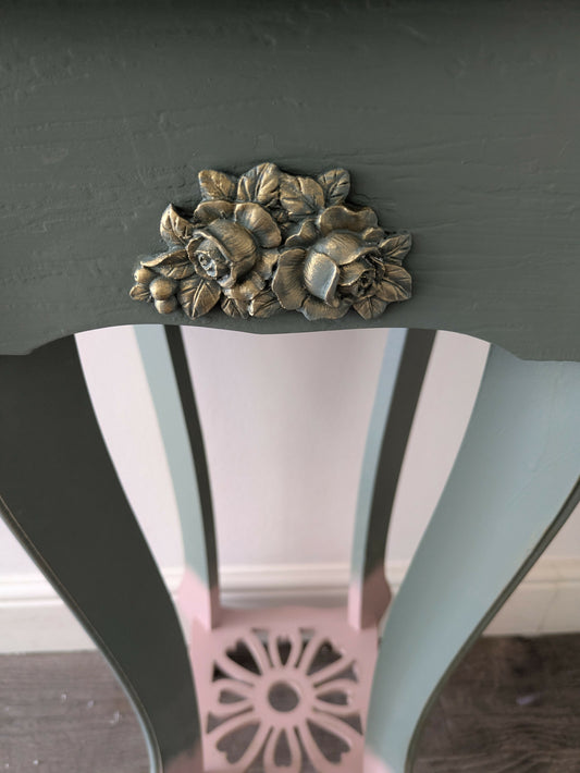 Vintage console table in deep olive green with scroll and vine detail