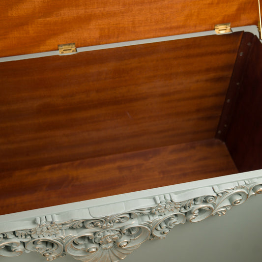 Upcycled Stag Minstrel Blanket Box – Oxford Fog, WoodUbend Carving & Pale Gold Accents