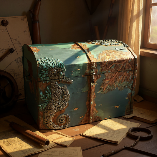 Upcycled Large Hand Painted and Hand Sculpted SEAHORSE Pirates Ocean Coastal Blanket/Toy/Storage Trunk Box. Unique, RARE, One of a Kind!