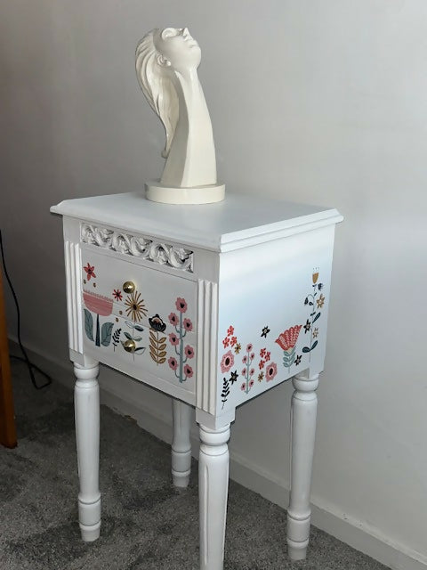 Black and Dark Walnut Vintage Bedside cabinets with Floral Butterfly Front