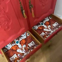 MADE TO ORDER: Upcycled sideboard/buffet with wallpaper fronts, drawers – Dark navy sideboard, Giraffe themed wallpaper