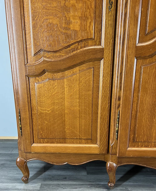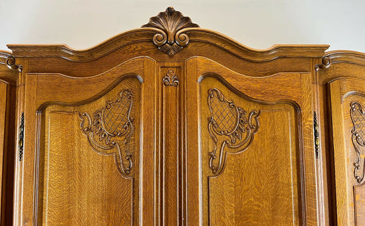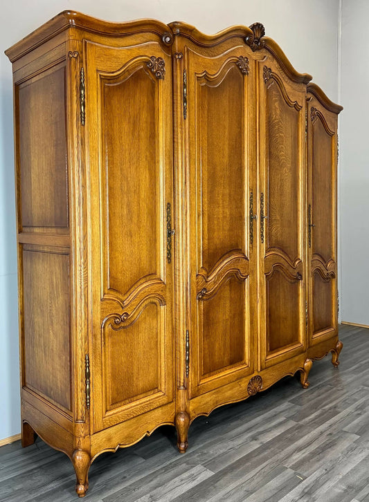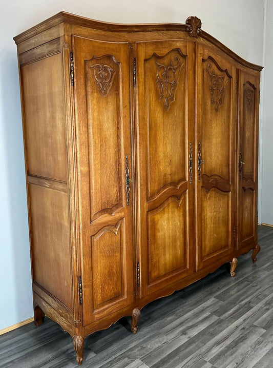 Vintage French Wardrobe Armoire 4 Door Oak Louis XV Style Carved Solid Wood Closet Cupboard Bedroom Storage LOT 4151
