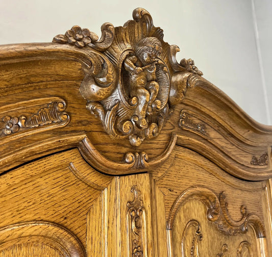 Vintage French Wardrobe Armoire 4 Door Oak Louis XV Style Carved Solid Wood Closet Cupboard Bedroom Storage LOT 4156