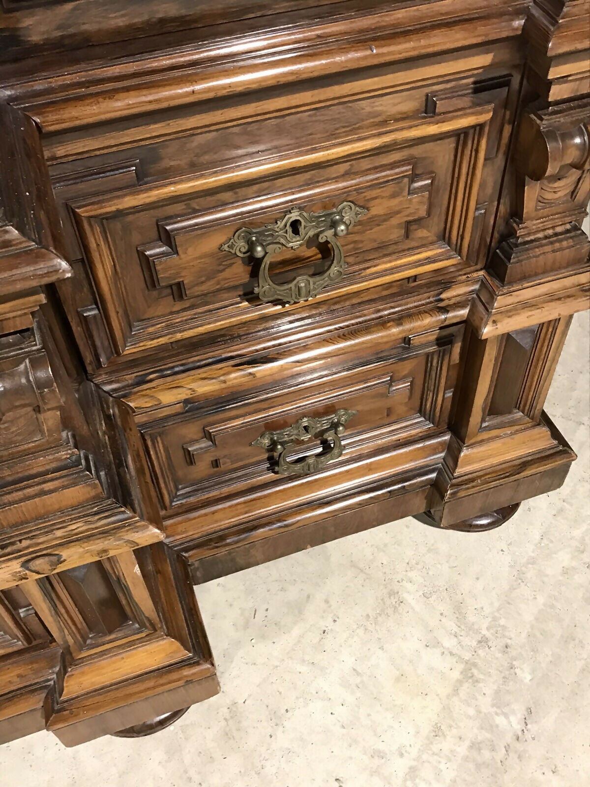 Monumental ornate Antique armoire in good Antique Condition. We think it may be Dutch, sometimes described as a Cushion Cupboard or Kussenkast due to the cushion like panels on the doors / drawers. Incredibly ornate throughout. Two cupboards with hanging rails and one with shelves. Some parts solid wood some parts veneer, there a few small chips on the skirting veneer but generally good. Mirror is in good condition. Interior is in nice clean condition for it’s age.