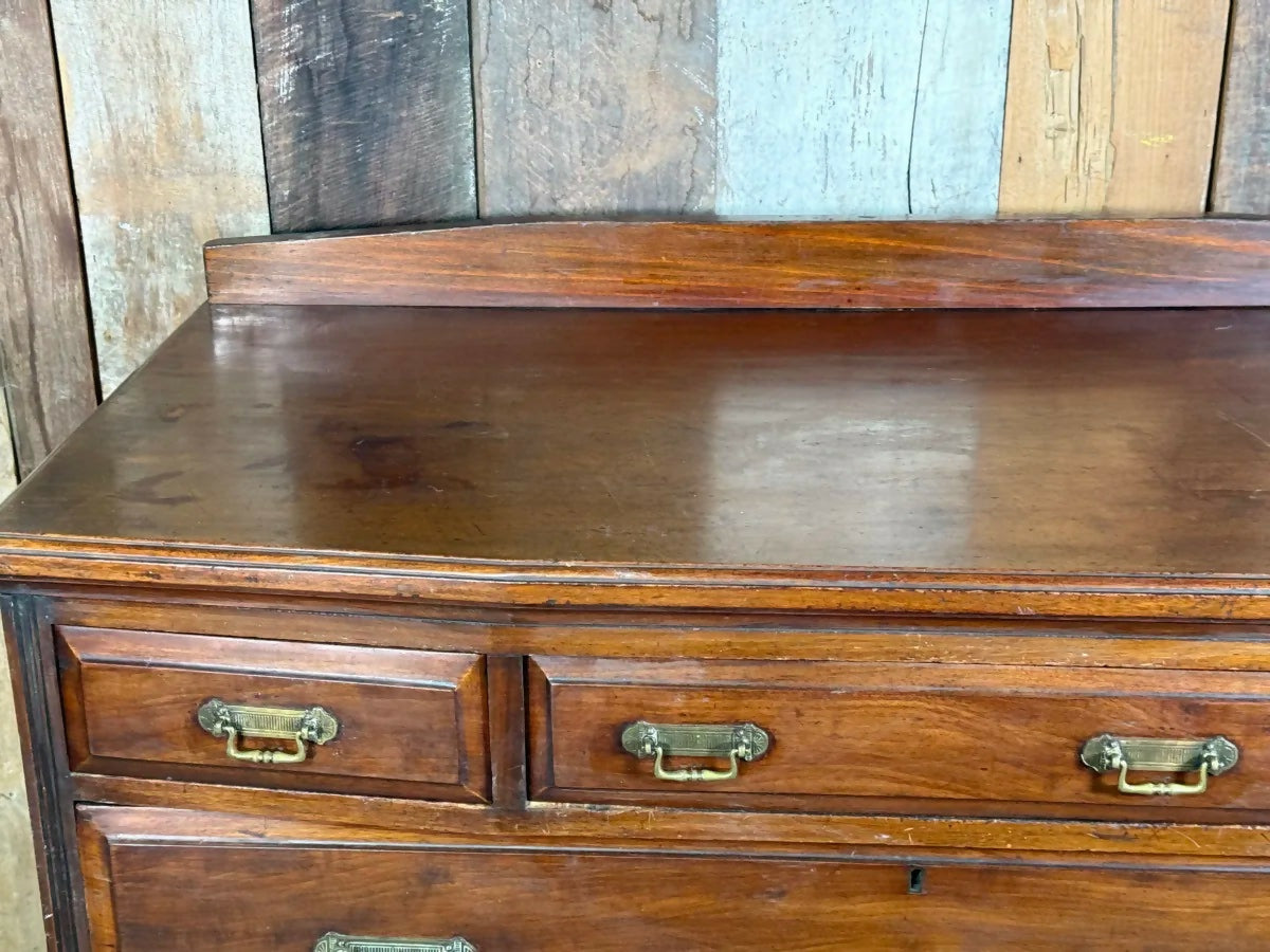 An unusual solid mahogany dressing chest of five drawers, dating from the early 1900’s. Breakfront top with shaped rear gallery, over three short and two long graduated frieze drawers, brass handles. Bracket feet.