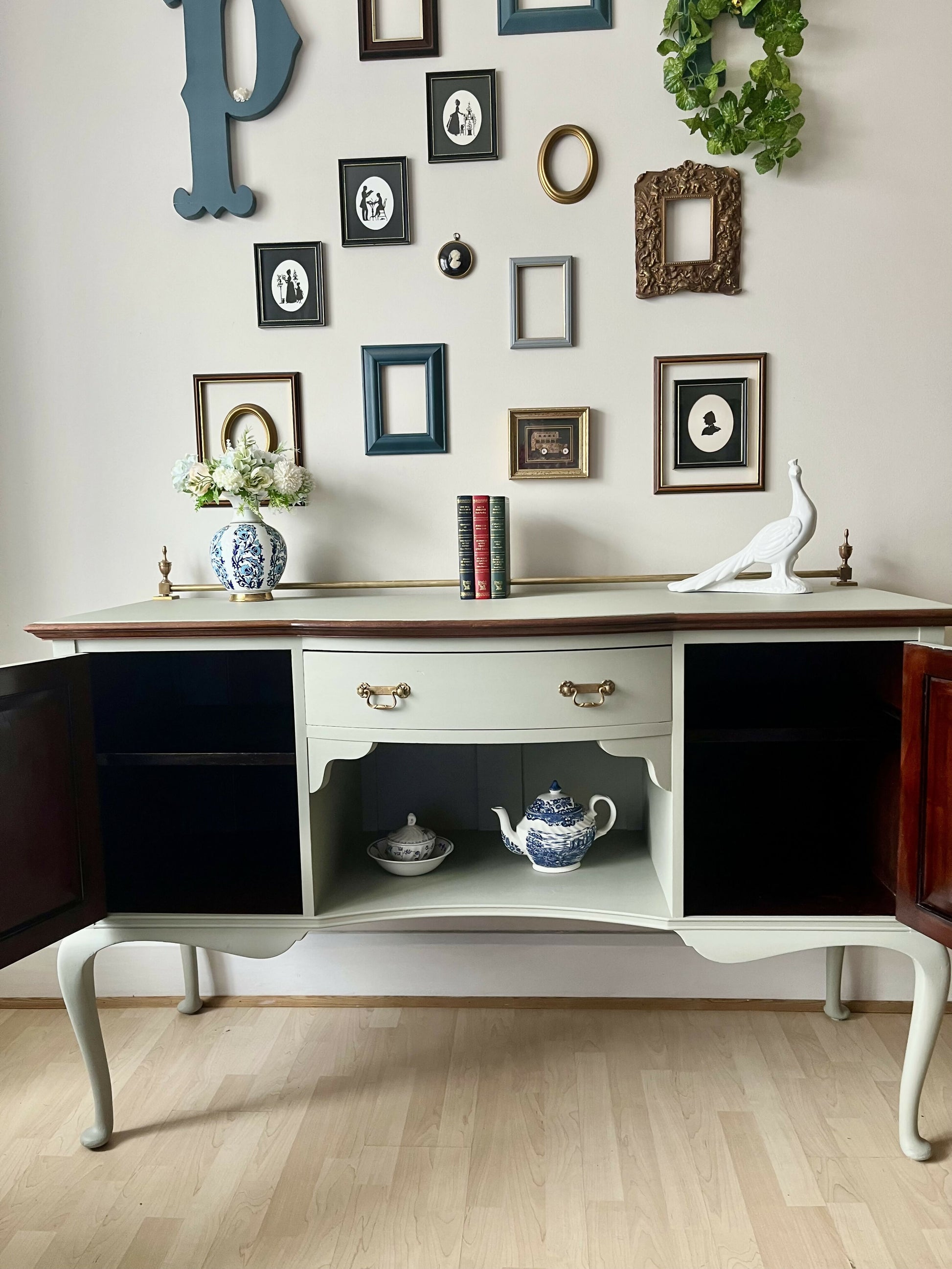 Antique Large, Solid Sage Green Greyish Sideboard: Bow-Fronted Cabinet with Brass Rail