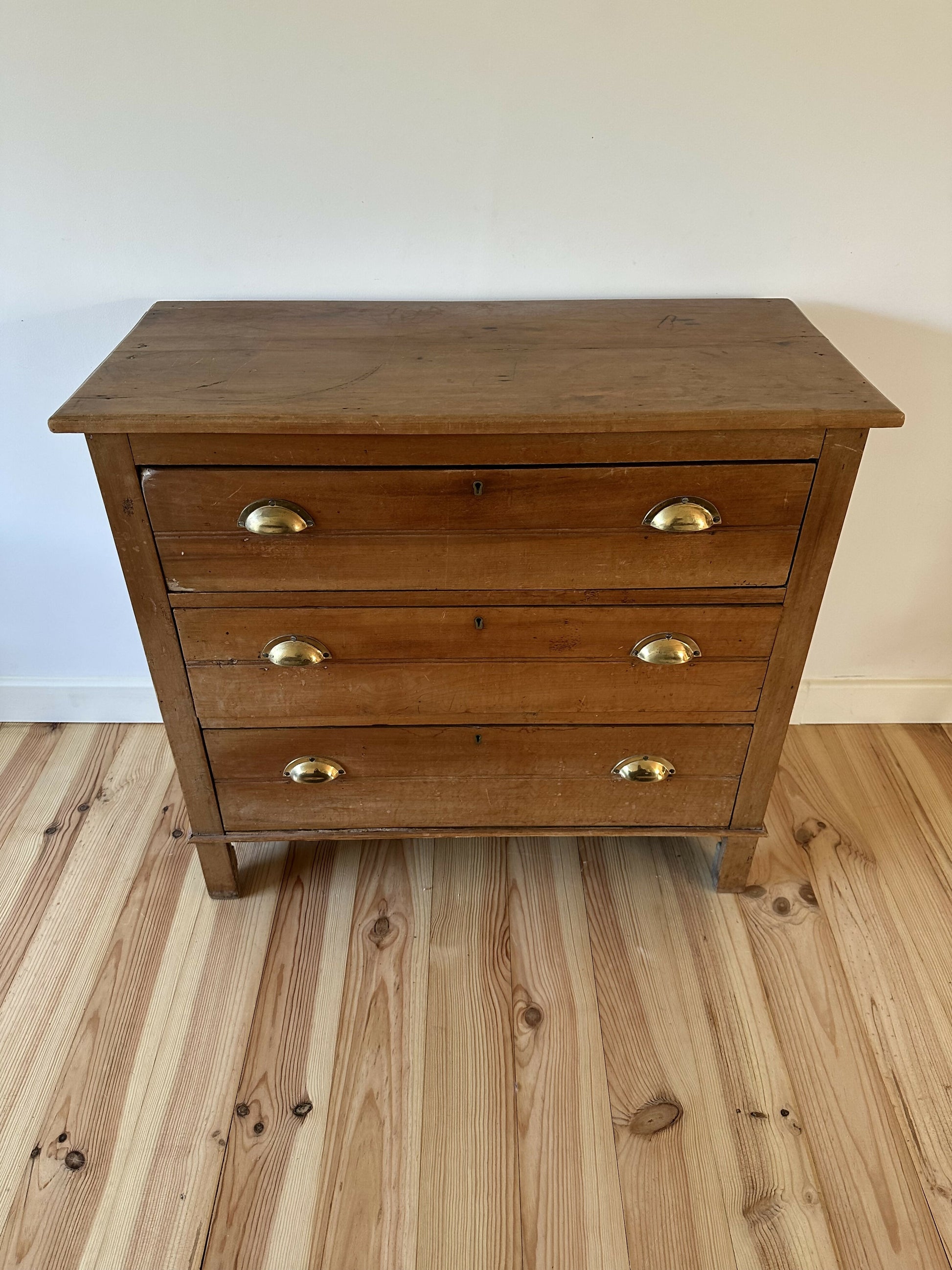 It has three drawers with brass scoop handles and brass escutcheons ( no key )