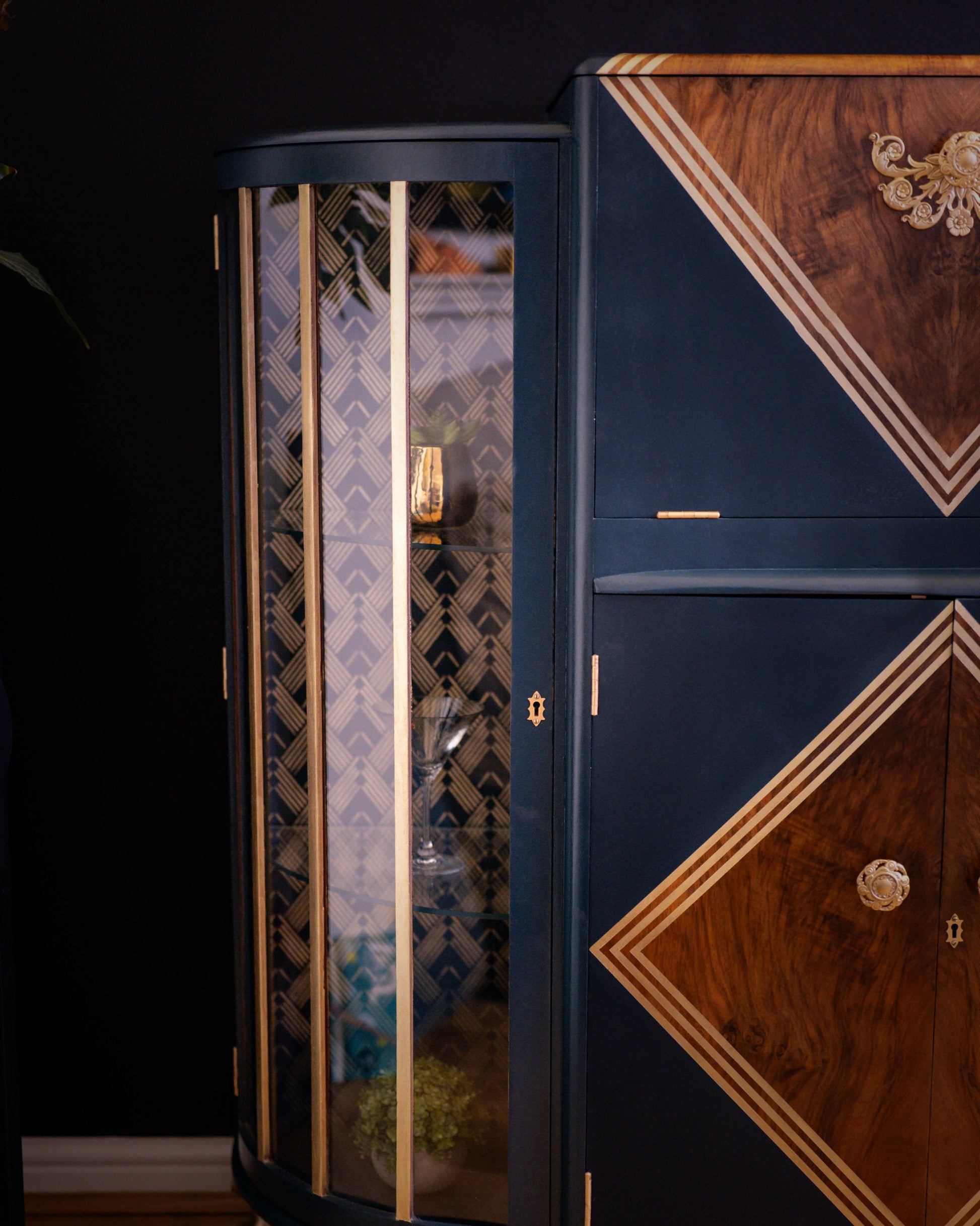 Adding to its uniqueness, the cabinet's interior backing has been hand-stencilled in a luxurious gold geometric pattern, reflecting the iconic boldness of the Art Deco era while adding a modern flair.