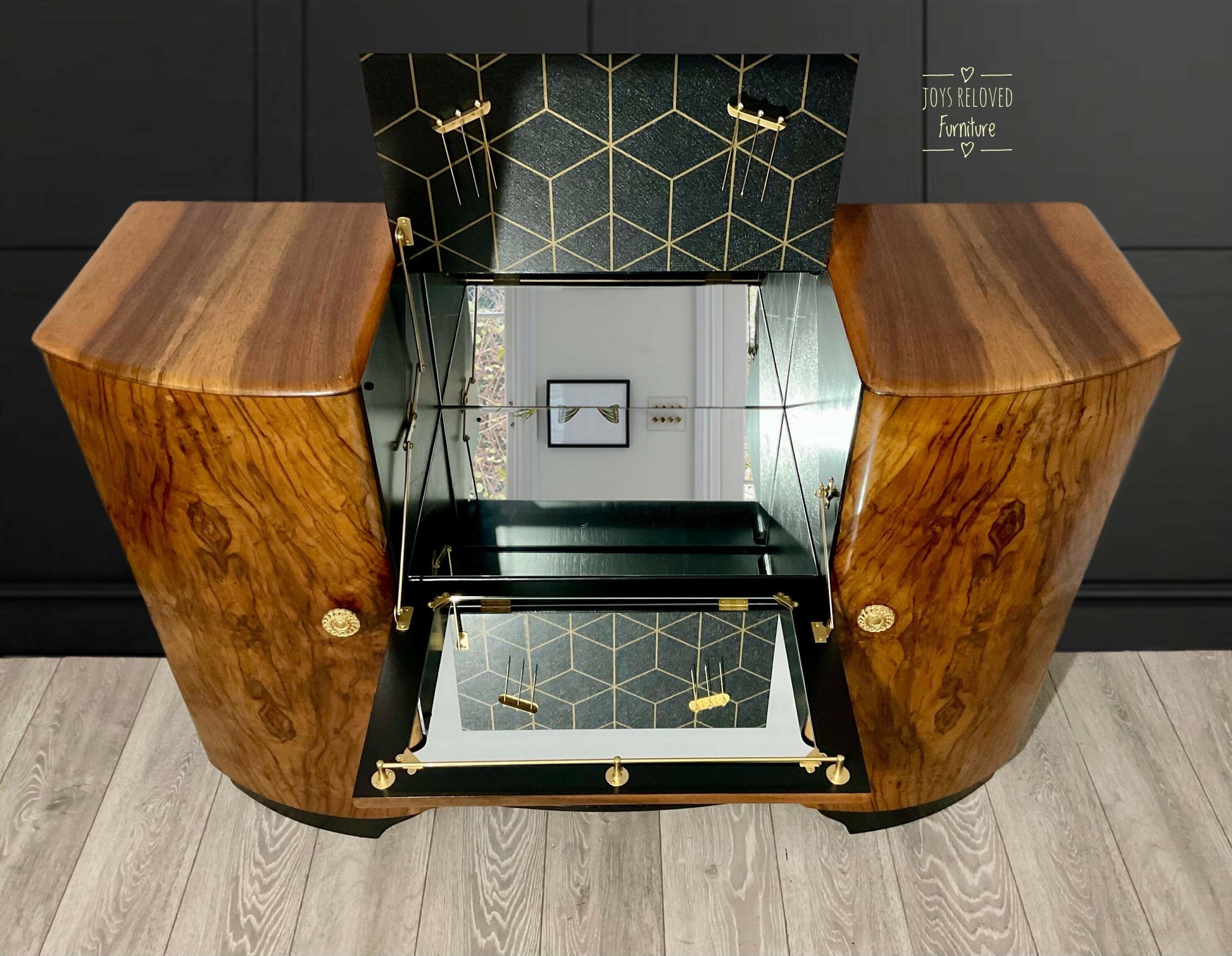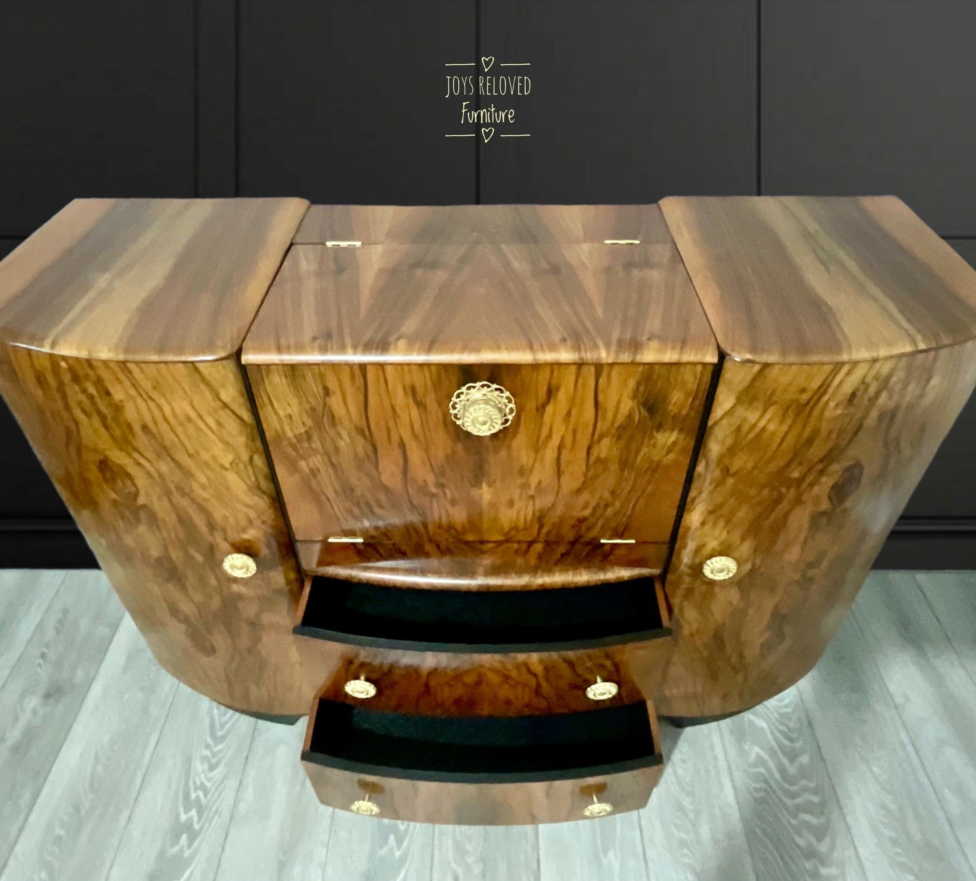 This Art Deco drinks cabinet has been professionally refinished, by being cleaned, stripped back and revarnished. The lovely walnut burr veneer has been nourished using several coats of hard wax oil to enhance the beauty. The drop down serving section and base has been handpainted in Fusion toxin free mineral paint coal black and sealed with satin varnish. The internal cocktail bar area has new mirrors.