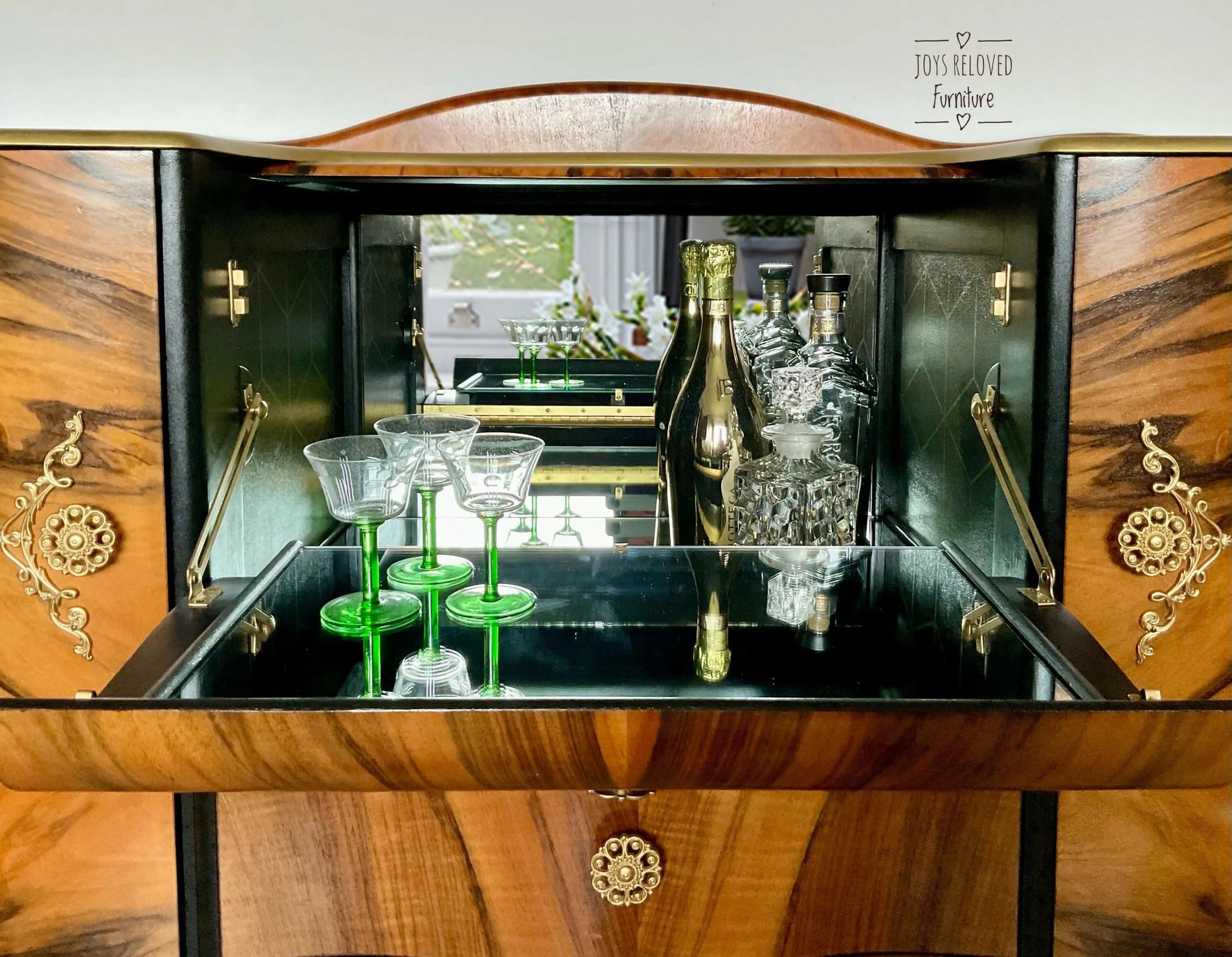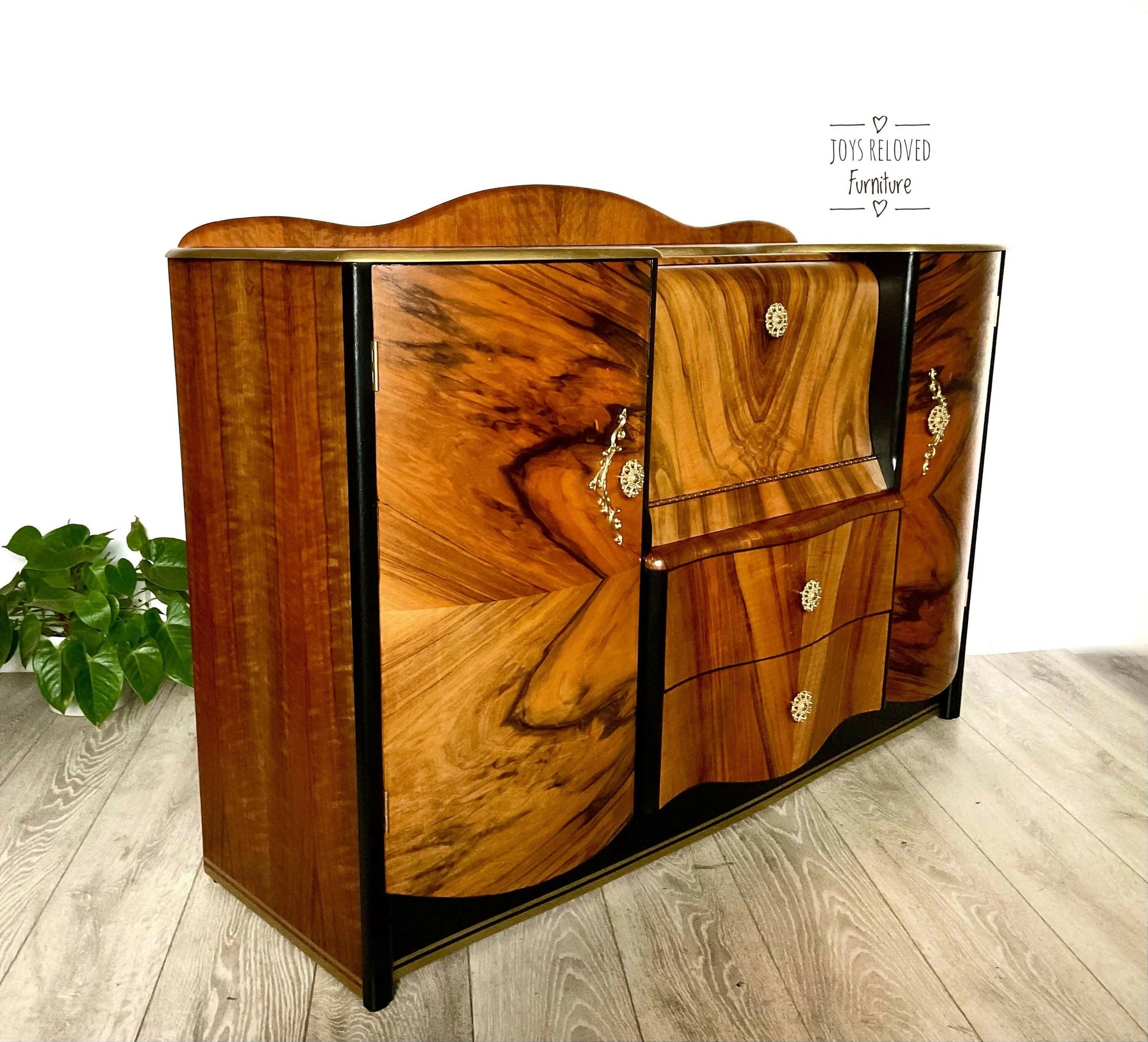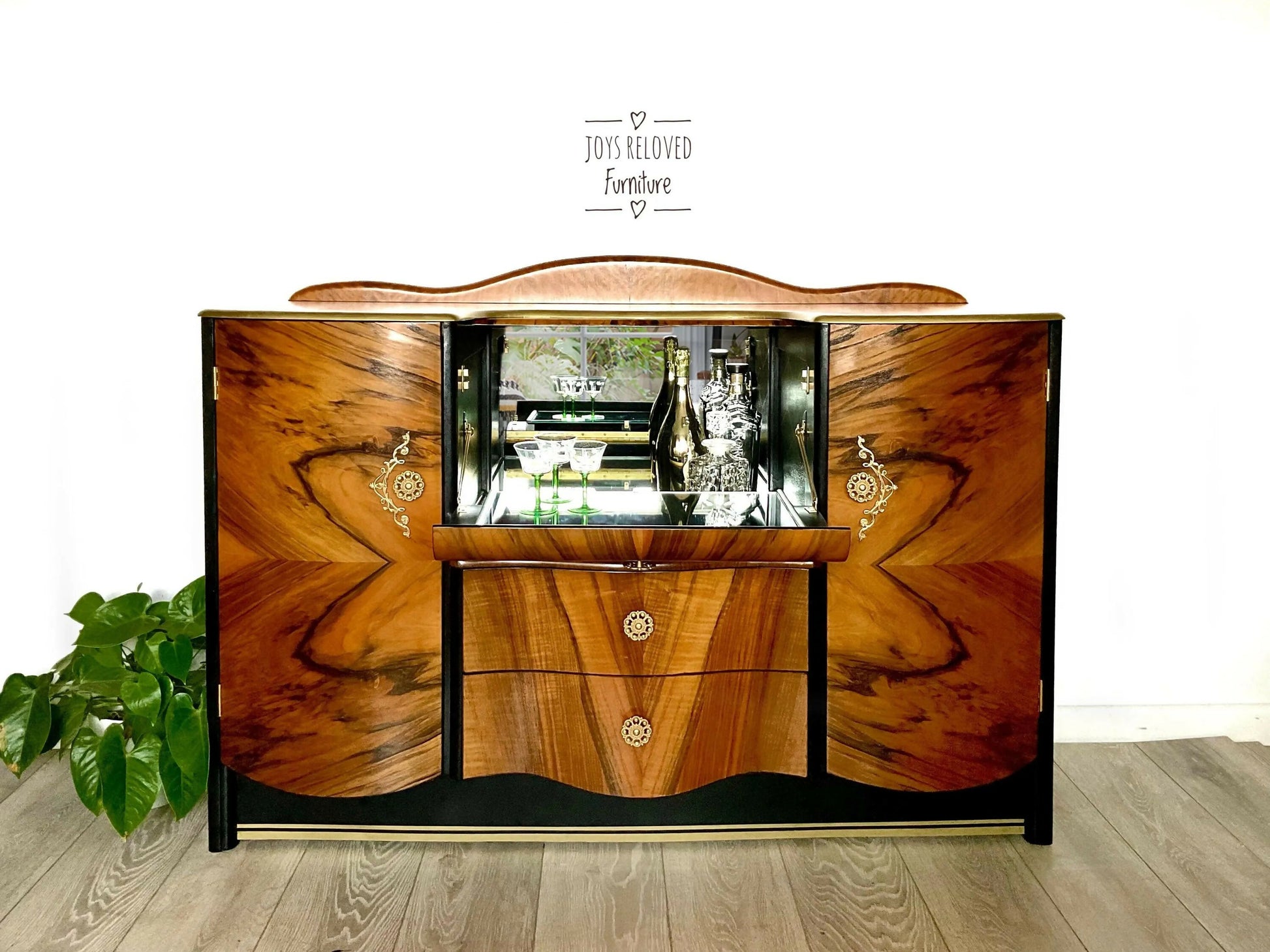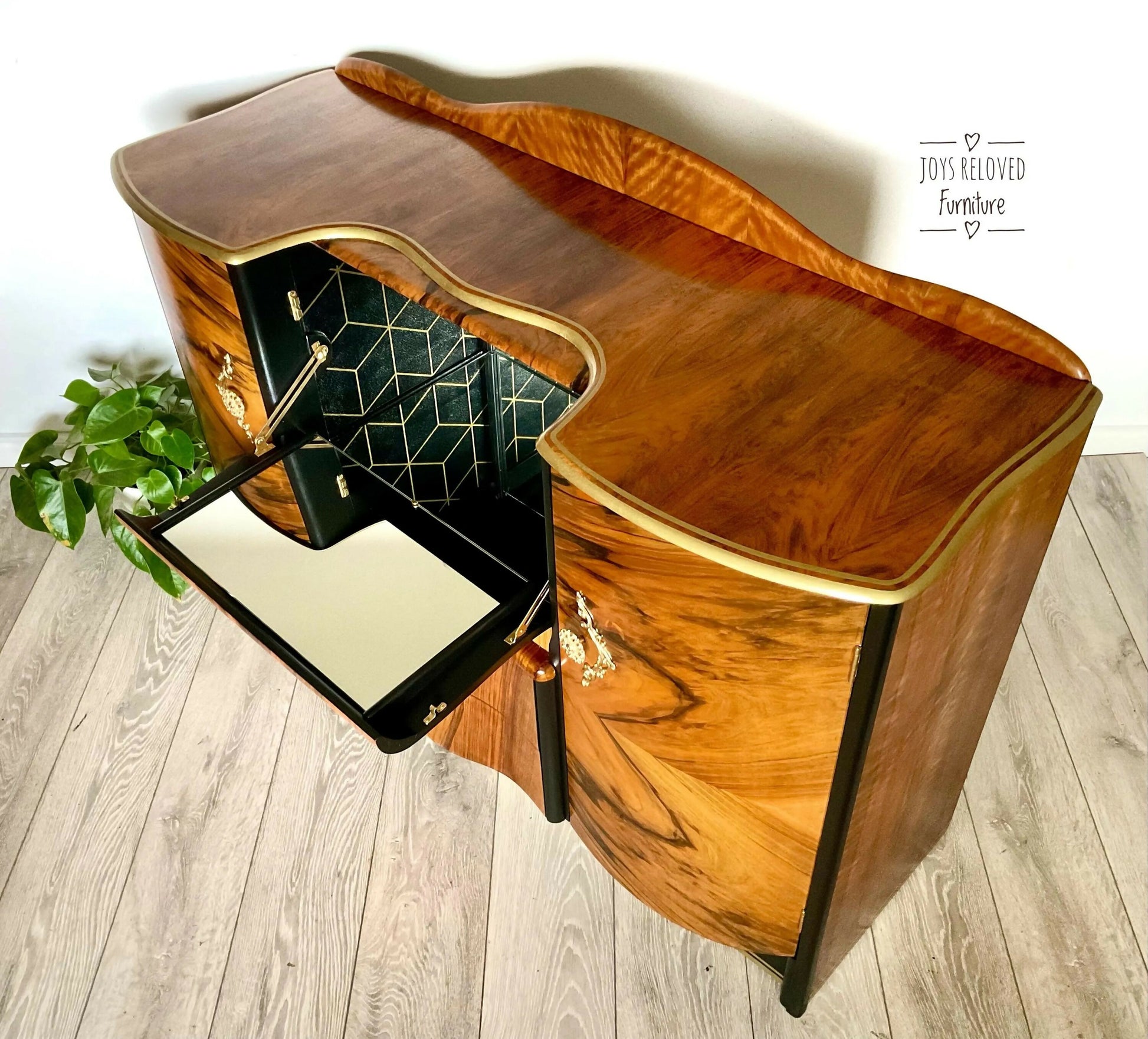 This Art Deco drinks cabinet has been professionally refinished, by being cleaned, stripped back and revarnished. The lovely walnut burr veneer has been nourished using several coats of hard wax oil to enhance the beauty. The drop down serving section and base has been handpainted in Fusion toxin free mineral paint coal black and sealed with satin varnish. The internal cocktail bar area has new mirrors.