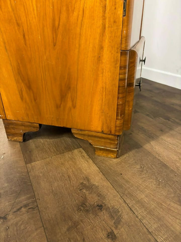 This striking Art Deco gents wardrobe is crafted in beautifully figured walnut, displaying dramatic book-matched veneers across the double doors and lower drawer. The rich grain patterns and warm tones give the piece a strong decorative presence, complemented by the soft curves and stepped edges typical of 1930s design.
