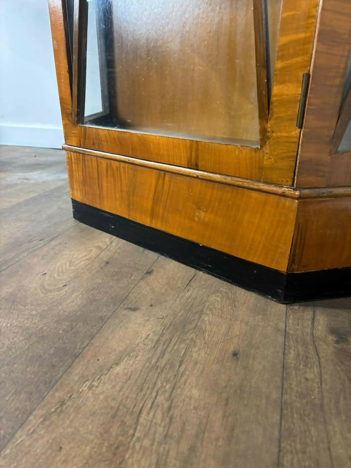 A striking Art Deco display cabinet dating from the 1930s, featuring the clean geometric lines and warm veneers typical of the period. Its angular form and glazed panels make it an eye-catching piece for showcasing treasured items.