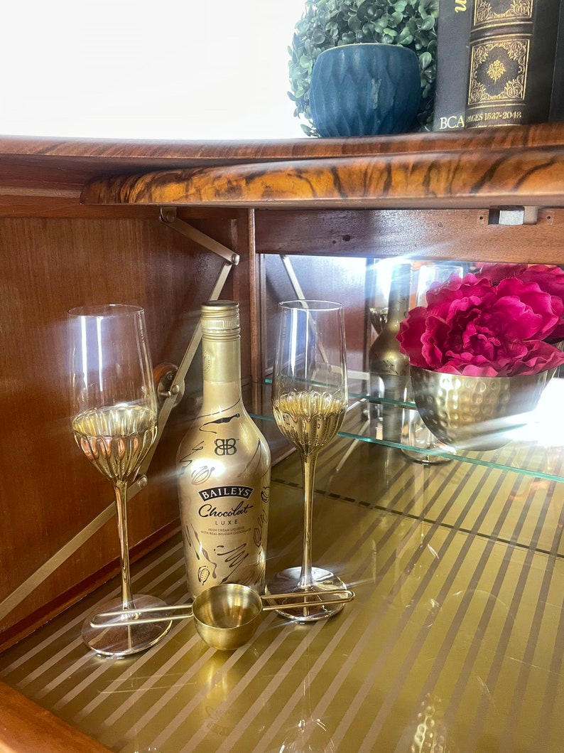 Make your drinks in style by pulling down the cocktail cabinet door using the original hardware (which has been respected gold) and feast your eyes on one of the beautiful Beautility features, the gold striped glass base, this is reflected in the rear mirror also. At the rear is an additional small shelf to hold those small glasses.