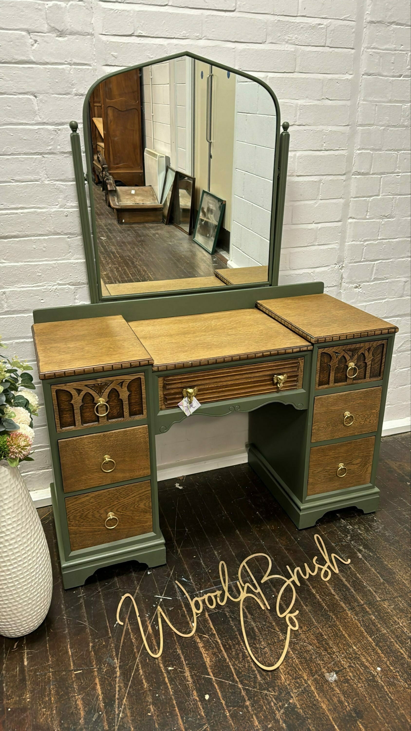 Beautiful Vintage Oak Linenfold Carved Old Charm Dressing Table And Mirror Green Gold