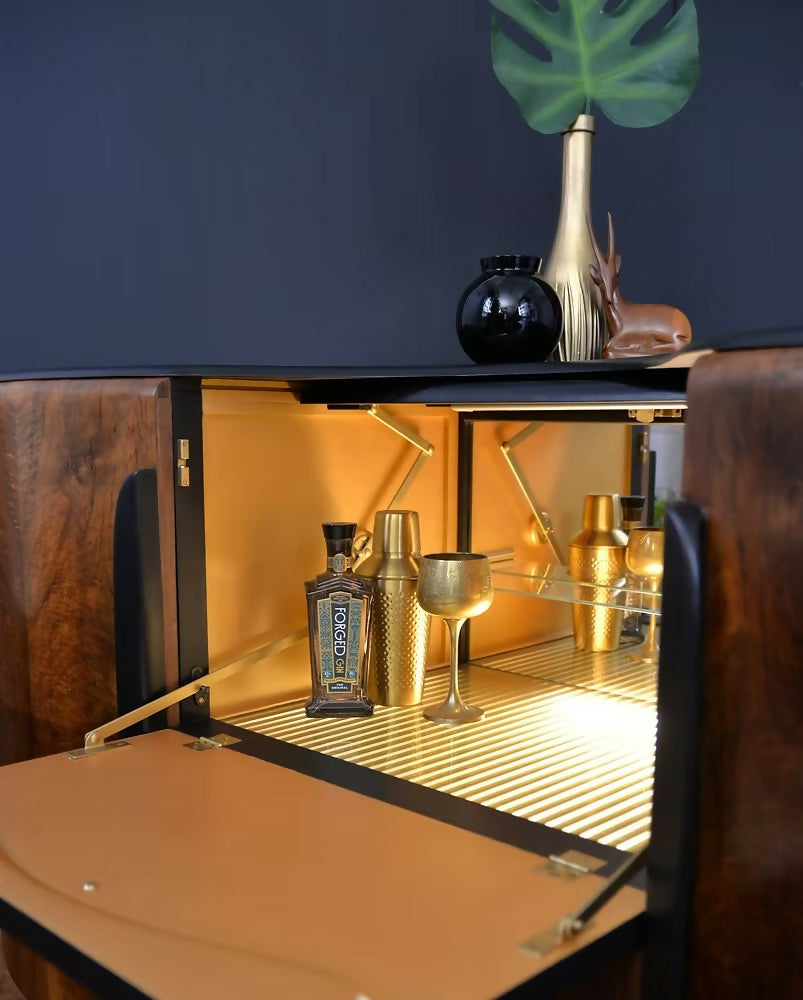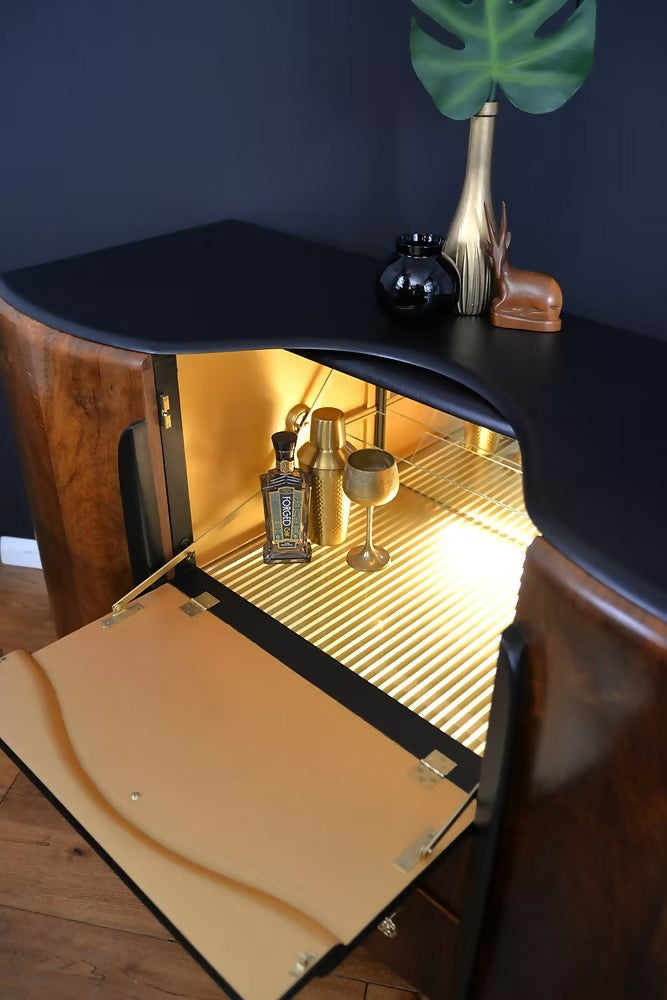 This 1950's drinks cabinet made by Beautility has been taken back in time to the Art Deco era, professionally restored painted in coal black and metallic gold paint.