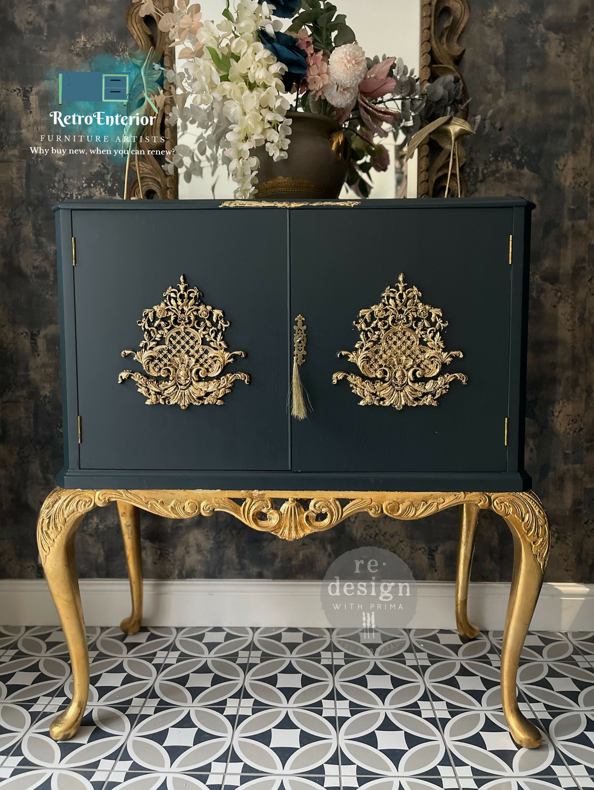This upcycled Art Deco cocktail cabinet is a stunning fusion of vintage glamour and modern innovation. The cabinet retains the timeless elegance of the Art Deco style and luxurious materials, while incorporating sustainable, eco-friendly craftsmanship. It is elevated on elegant gold Queen Anne legs, which provide a graceful, yet sturdy base. Inside, the cabinet features a striking gold stencil design that adds a touch of opulence to its interior. A motion sensor light illuminates the space, subtly enhancing the cabinet’s contents as you approach, while a mirrored back panel adds depth and reflects the beauty of the surrounding space.