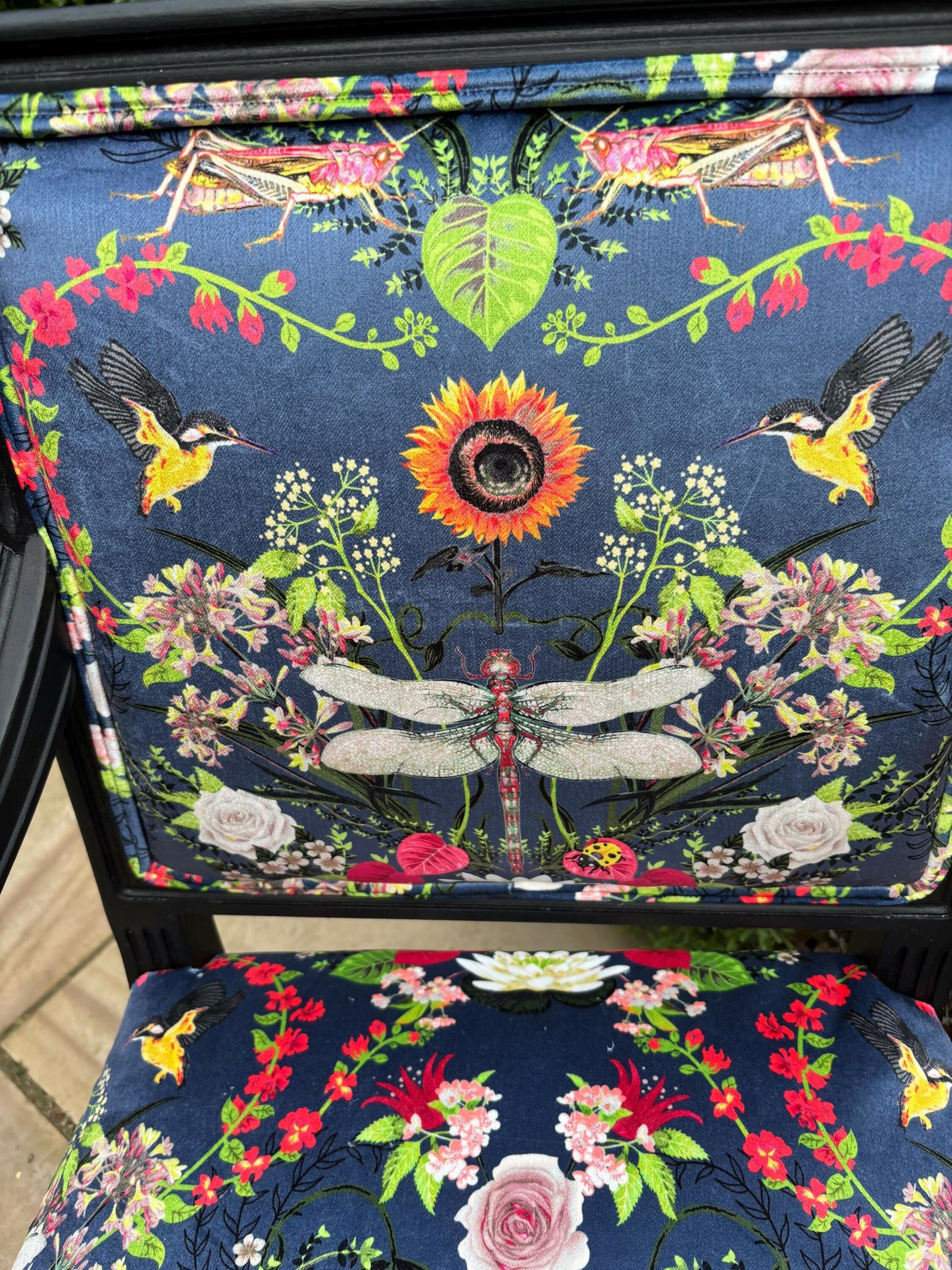 This elegant wooden frame has been finished in a deep, coal black, allowing the striking upholstery to truly shine. The fabric features a rich, blue background adorned with vibrant botanical creatures—delicate hummingbirds, blooming florals, and a dramatic dragonfly centerpiece—creating a piece that feels both luxurious and full of life.