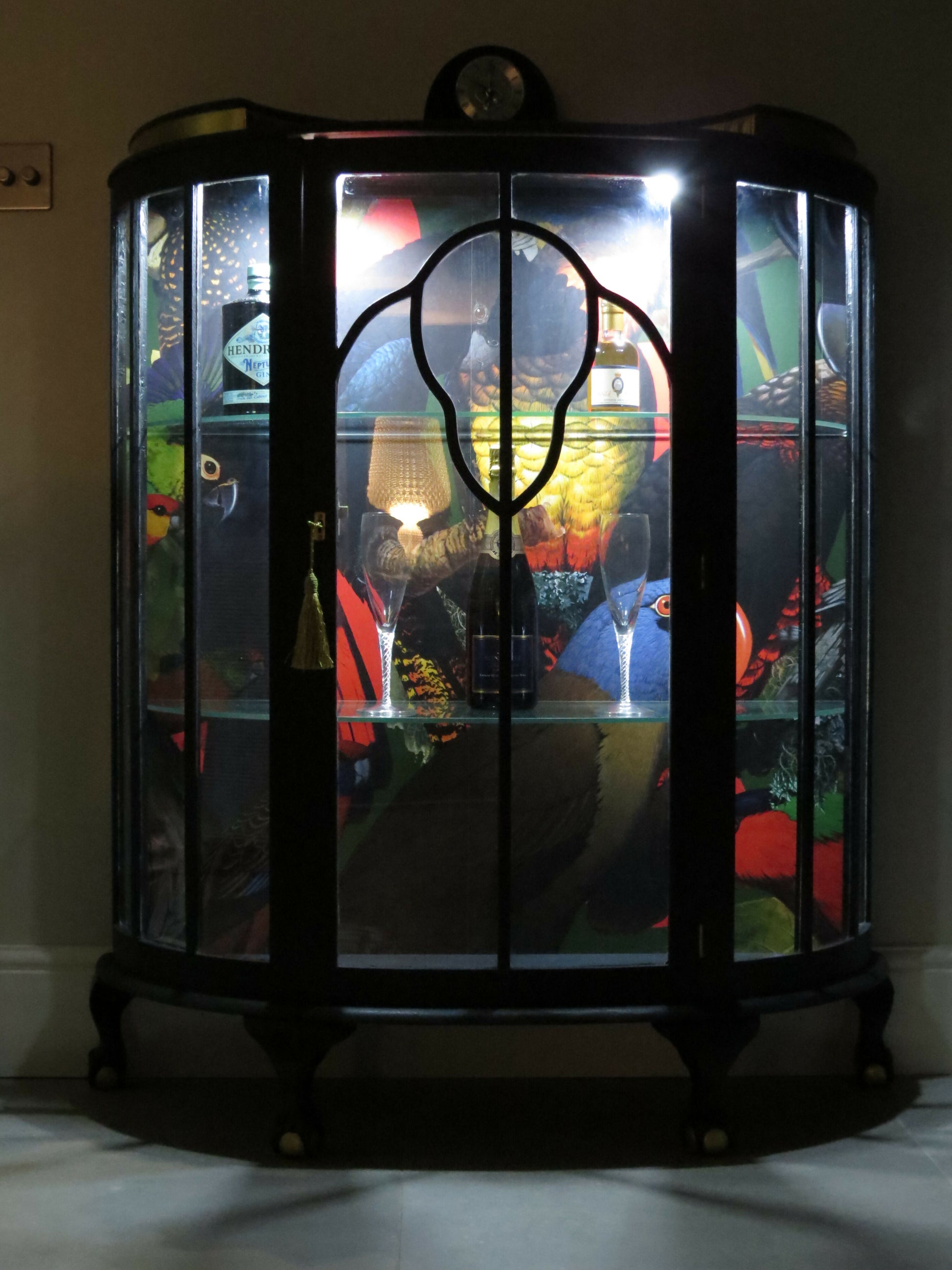 Two motion-sensor battery powered lights have been fitted. It has two glass shelves and comes with it's original, working key with decorative tassel.