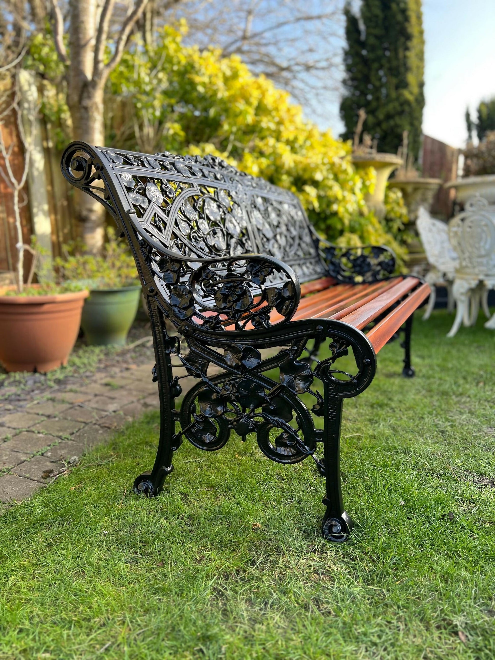This is a fully restored Cast Aluminium Copy of the Famous Coalbrookdale Nasturtium, it was Salvaged, Sandblasted and Powder Coated in Black, it is adorned with beautiful new Oiled Sapele Slats. This showstoppong Bench is 132.5cm wide, 88cm tall, 73cm deep, Seat height of 43 cm
