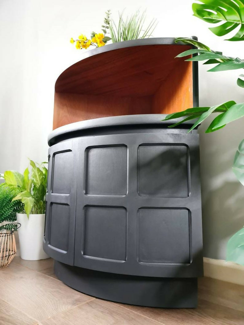 This neat corner unit features an open storage section, then underneath a cupboard section with two curved doors.