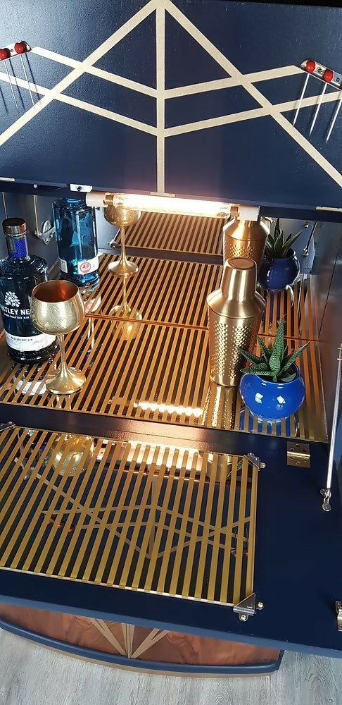 It has a drop down pull up lid which opens up to reveal a gold striped mirror preparation area perfect for serving up those cocktails.