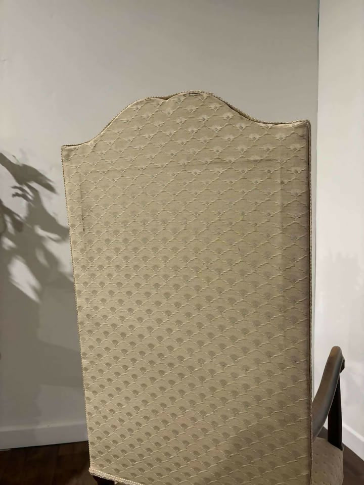 Upholstered in a tasteful neutral fabric with a subtle textured pattern, it blends seamlessly into both classic and contemporary interiors. The piece shows minor evidence of historic woodworm—fully treated and long inactive—adding to its authenticity and charm without affecting its structural integrity.