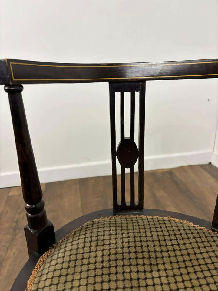 Charming Edwardian tub side chair, dating from the early 20th century. The frame features delicate inlaid detailing (wood type uncertain) with elegant vertical splats to the back and turned supports.