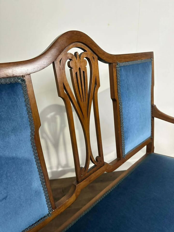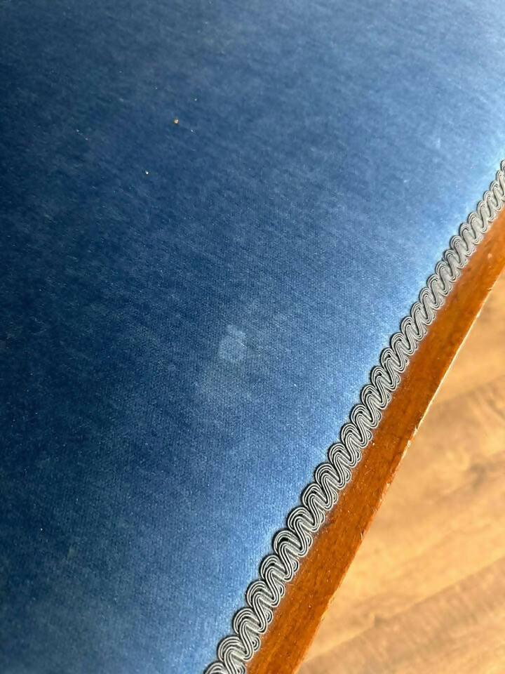 The seat and back panels are upholstered in a rich blue velvet, finished with a decorative brocade trim. There are a couple of small marks to the fabric, as shown, which may sponge out with care.