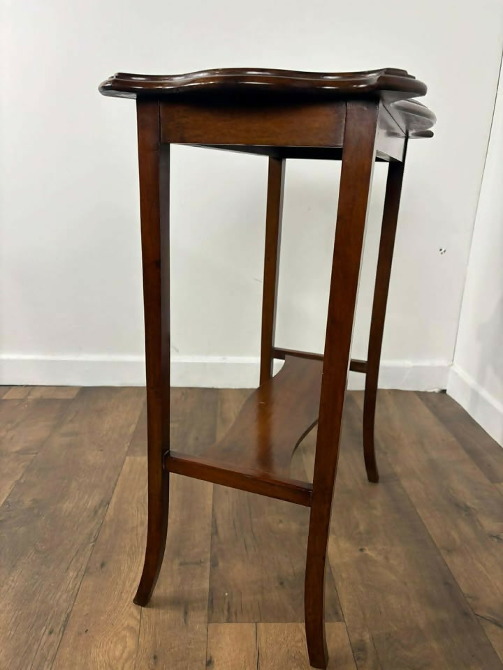 A charming Edwardian mahogany window table, featuring a beautifully shaped top and a practical lower undershelf. Elegant in its simplicity, this timeless design works seamlessly in hallways, living rooms, bedrooms, or as a decorative display table beside a window.