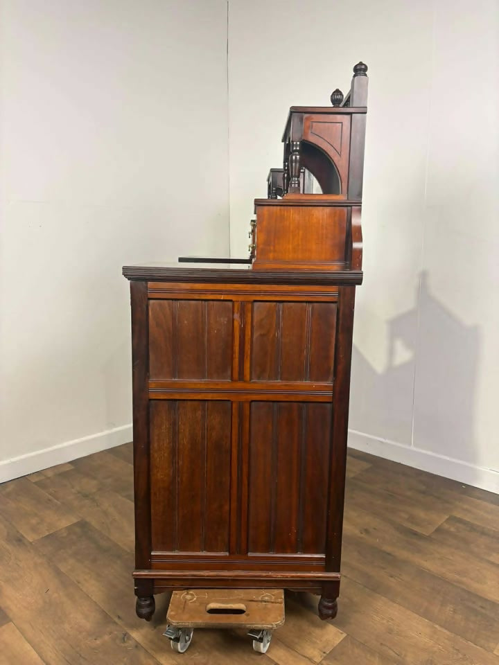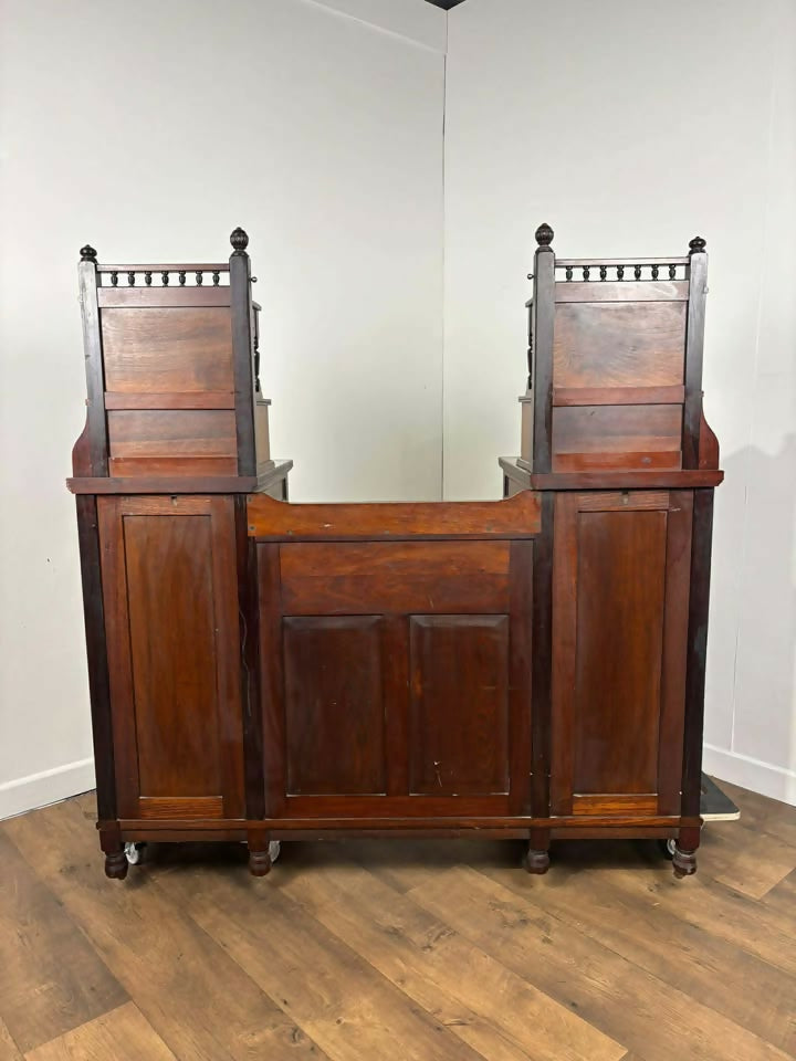 A substantial and impressive Edwardian pedestal dressing table, solidly constructed and extremely heavy, crafted in richly toned red walnut and notable for its quality workmanship and strong architectural presence. The piece displays attractive panelled detailing throughout, including the rear of the mirror—an indicator of thoughtful and well-executed craftsmanship.