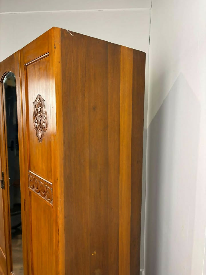 A well-proportioned Edwardian satin walnut single-door wardrobe, featuring a full-length mirrored door flanked by carved decorative panels. The warm tone and attractive grain of the walnut give the piece a pleasing presence.