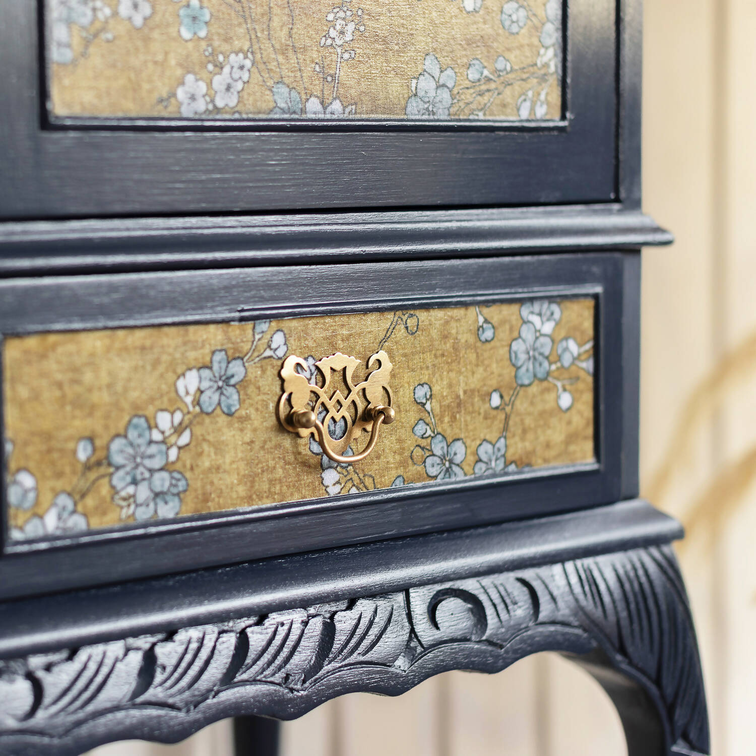 Introducing our vintage Queen Anne Style cocktail cabinet, a true showpiece of elegance with its slender cabriole legs, meticulously refurbished and infused with an Oriental touch.