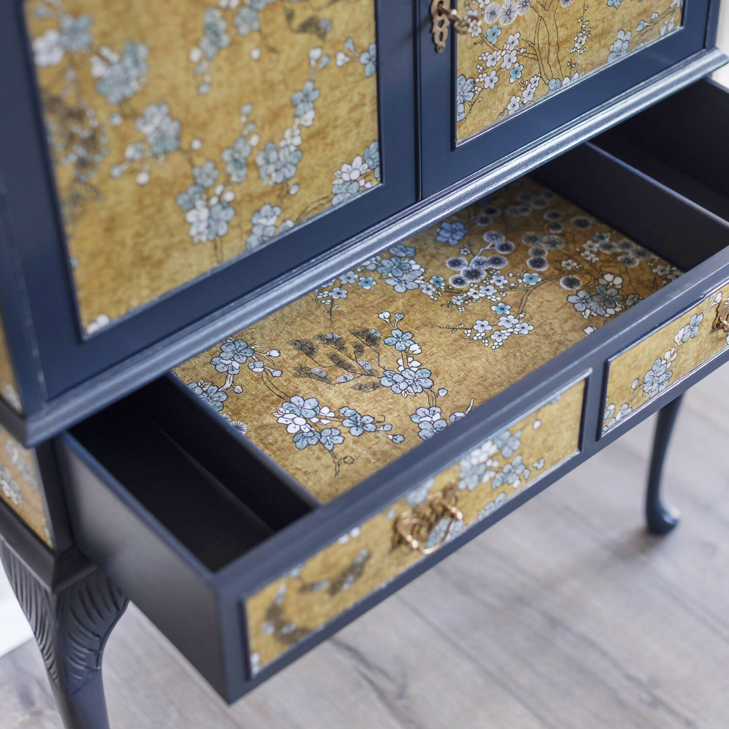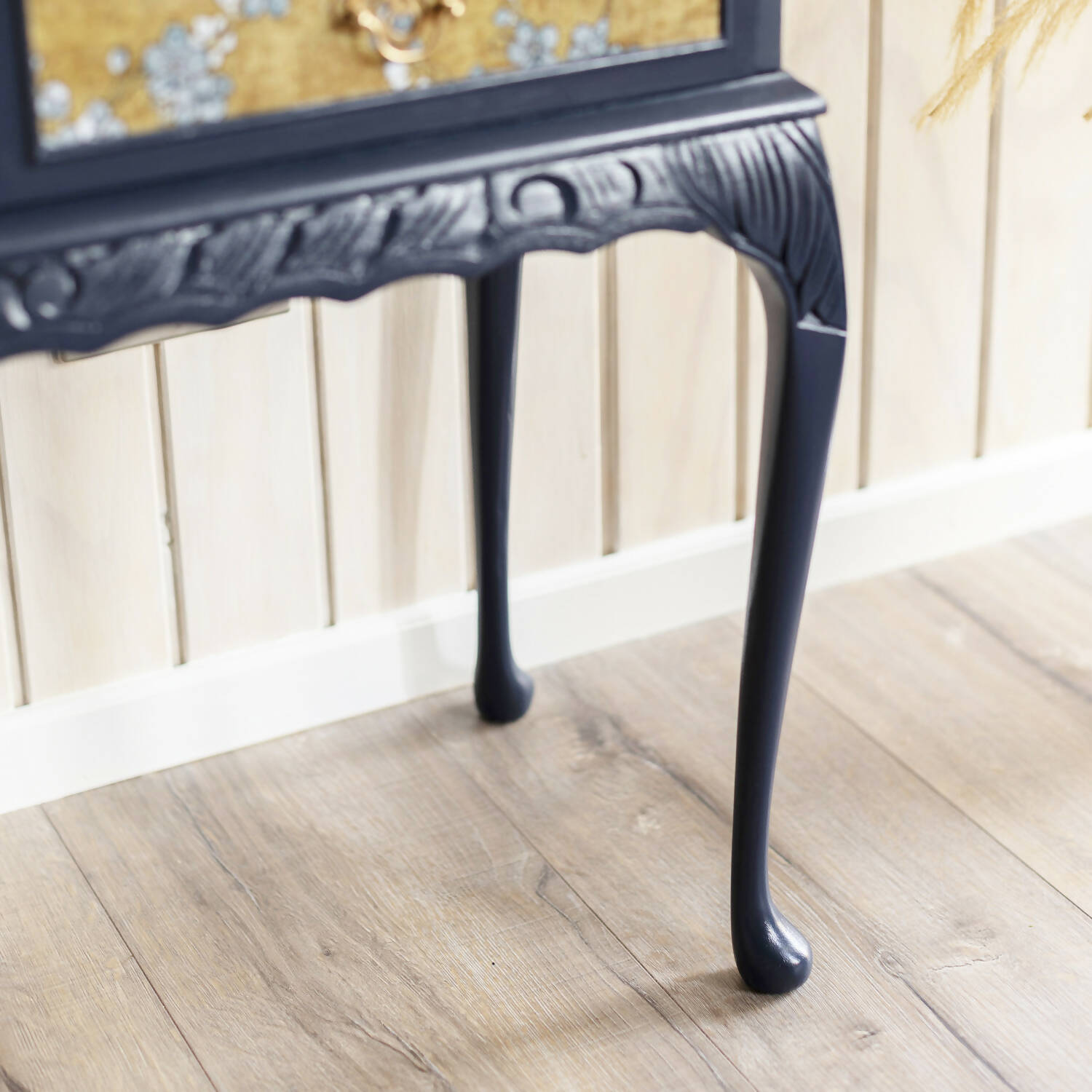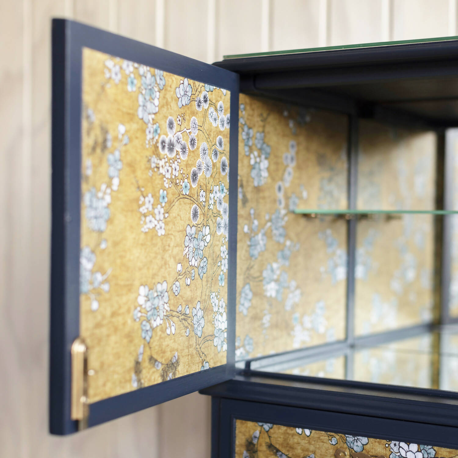 Exceptional vintage cocktail cabinet in midnight blue, boasting an oriental-inspired design. Sold, commission available.