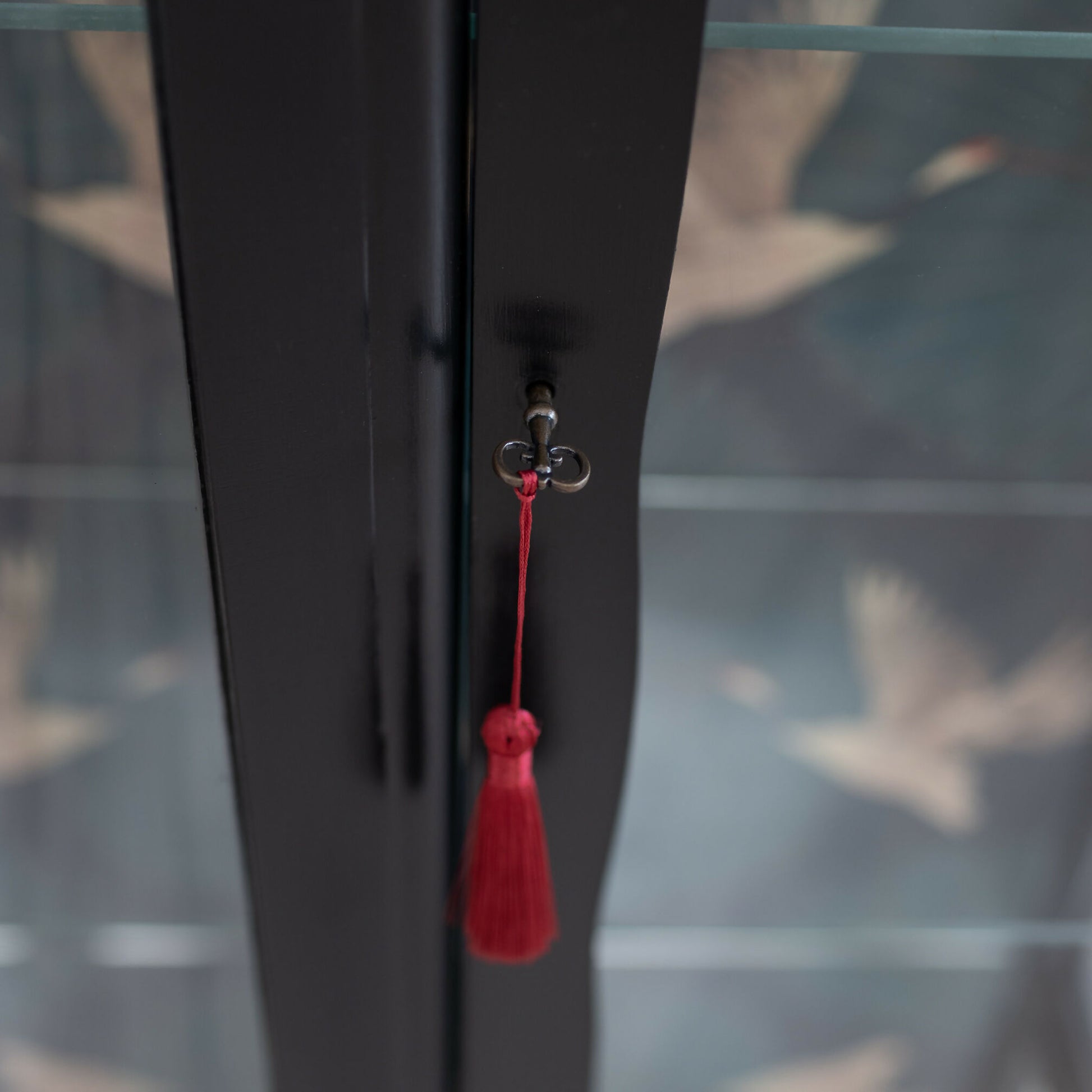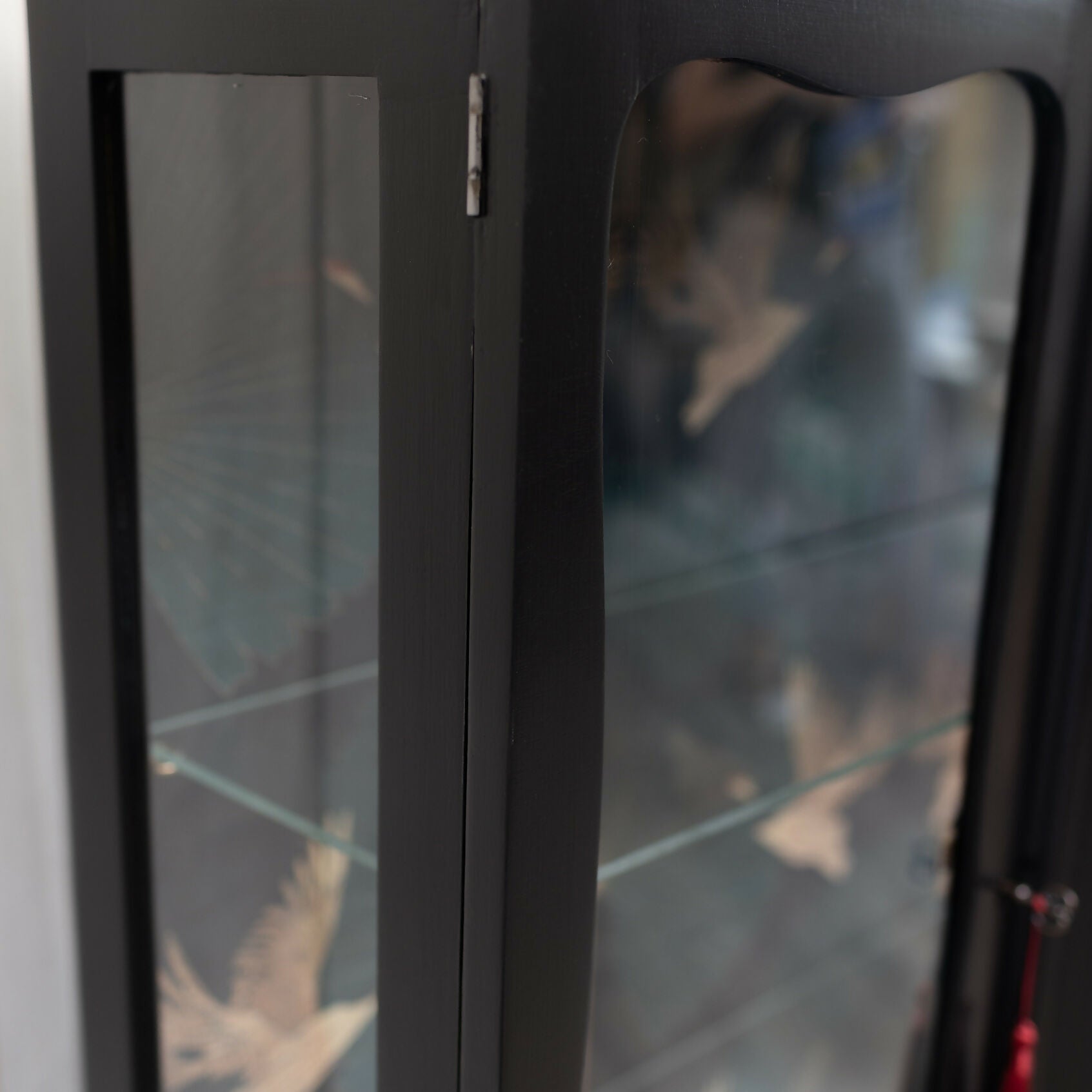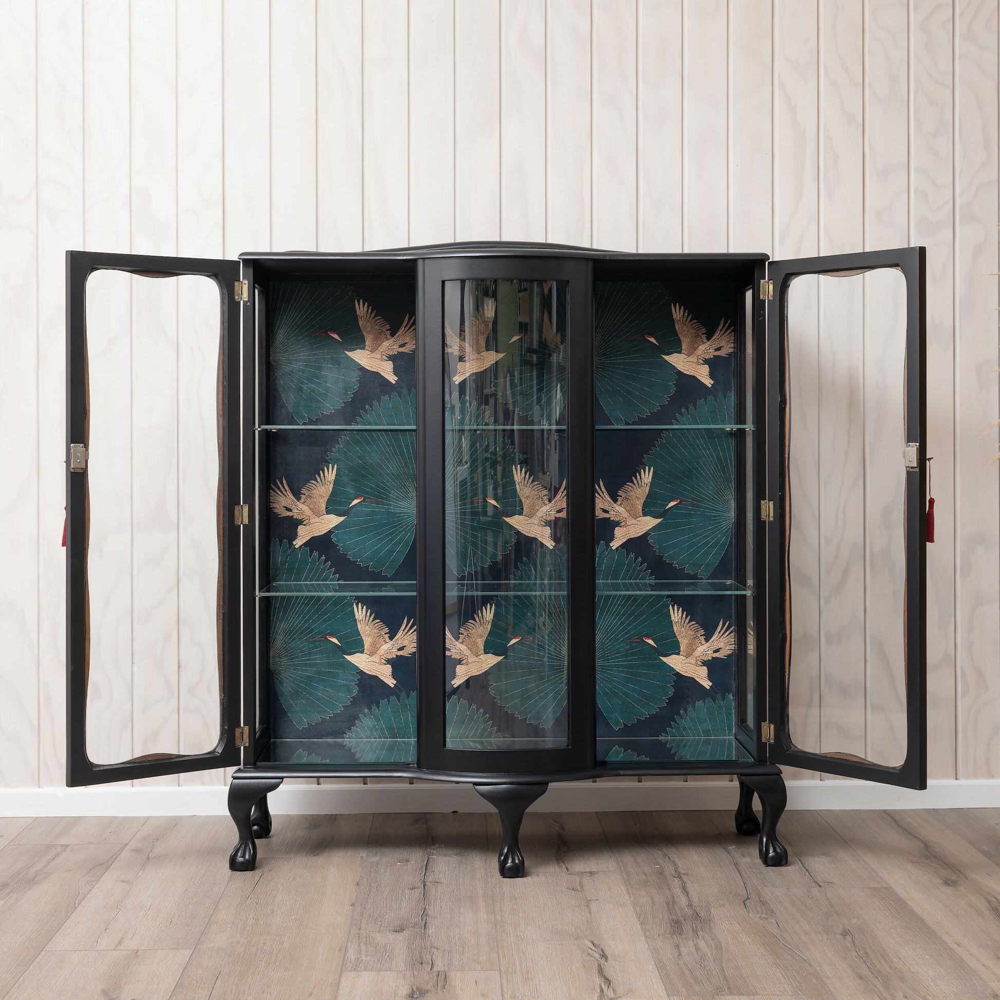 Available: Exquisite Art Deco drinks cabinet decoupaged in a striking blend of emerald green, subltle gold and black crane fabric.