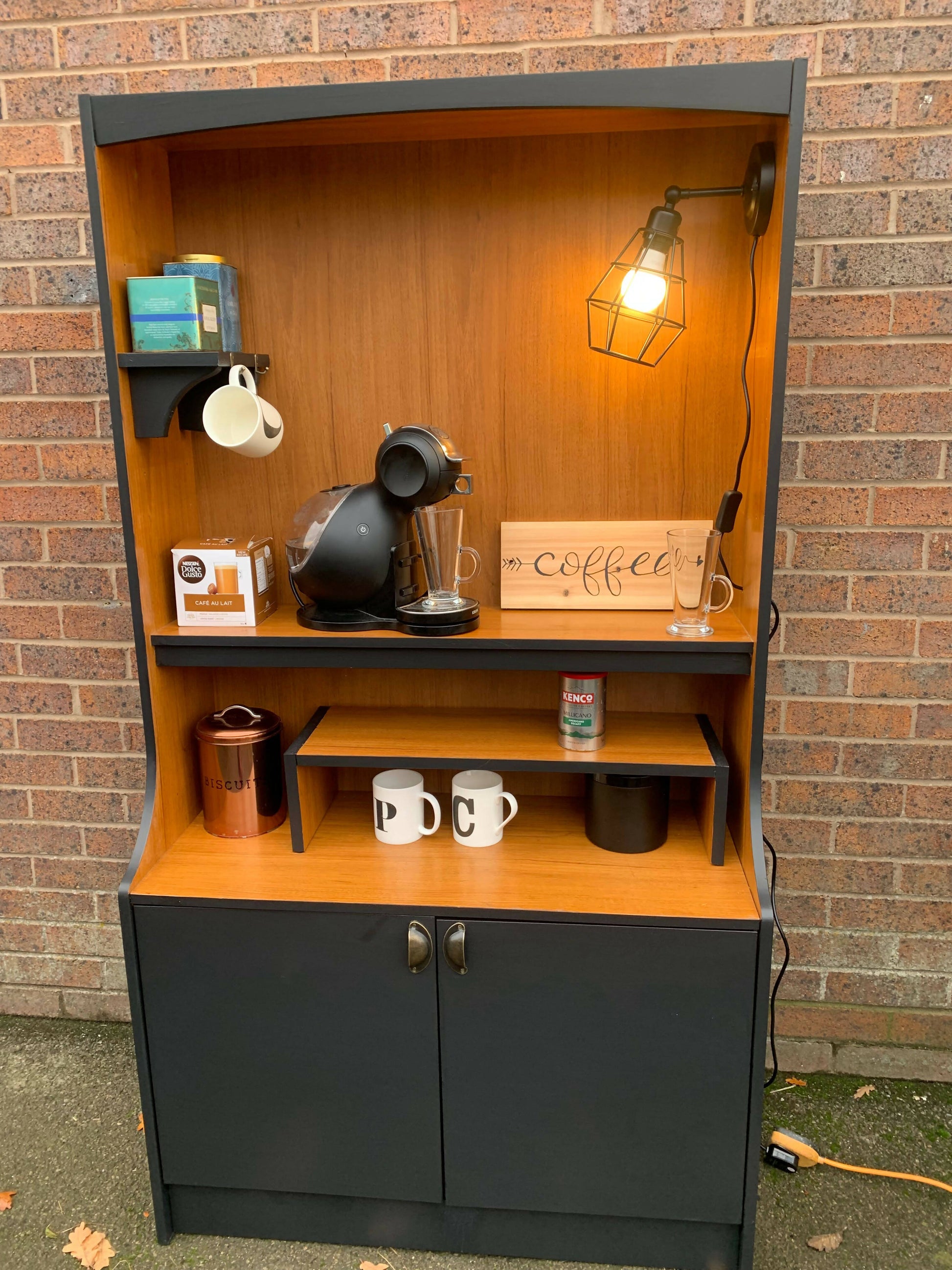 A 1970s original Schreiber wall unit that would sit perfectly in the kitchen for storage or in the dining room for making drinks. Or even in the office. It has a fixed shelf, two large cupboards below, a movable extra shelf with area for storage for mugs etc underneath! What a space saver! The addition of a stylish caged light really adds to the modernisation of this fabulous unit. In total keeping with its time it is made in teak laminate and is in excellent condition. It has been updated with rich black eggshell paint and now looks both retro and modern in equal measure!