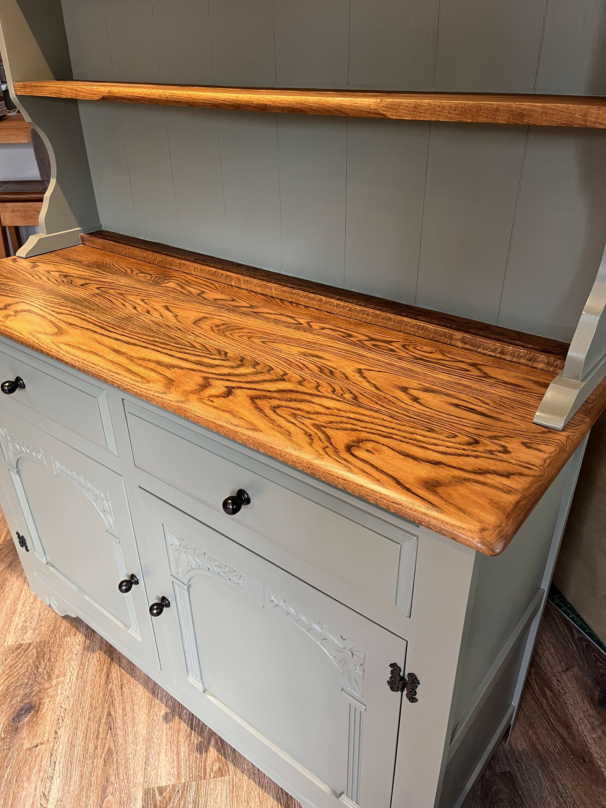 Bring quiet elegance into the heart of your home with this beautifully crafted dresser, where traditional character meets contemporary style. Finished in a soft, heritage sage with a warm, solid wood top, this piece is designed to anchor a modern kitchen while adding depth, texture, and soul.