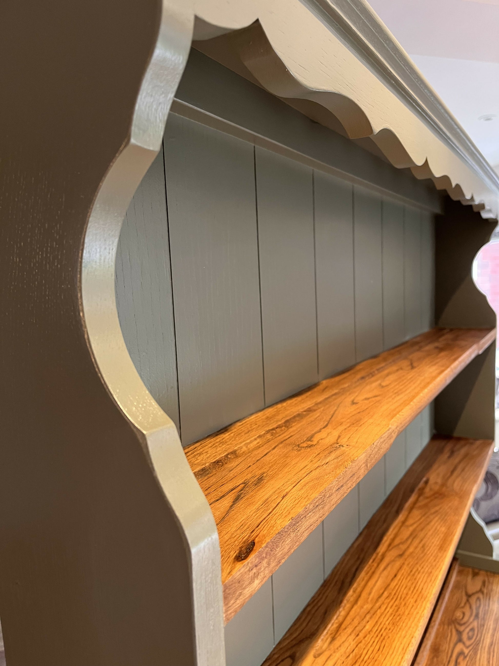 Gracefully scalloped detailing and classic panelled doors nod to its artisanal roots, while the clean lines and muted palette ensure it sits effortlessly within today’s interiors. Open shelving offers the perfect stage for ceramics, glassware, and everyday essentials, while generous cupboards and drawers provide discreet, practical storage below.