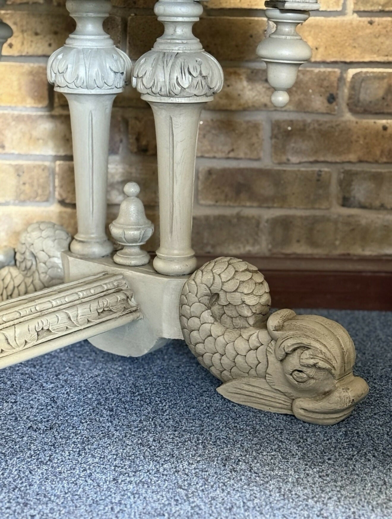 | A Beautiful example of Carved Oak Library table Featuring Lions heads and Dolphin carved supports Fully restored and finished in Farrow& Ball Treron. Design Period Before 1890 Production Period Before 1890 Country of Manufacture France Style Gothic Revival Detailed Condition Very Good — This vintage/antique item has no defects. Width 40 inches Depth 28 inches Height 29 inches Delivery: We can deliver to most places in mainland UK for £80. This does exclude the Highlands, Far Northern Scotland, Cornwall and Wales however we deliver to these places for an additional fee. For an accurate delivery quote please send your postcode. Our quotes are based on flexible availability of a two man delivery service to your door, It is not down to the courier to take items upstairs and or assemble furniture. Congestion zone charges would need to be added if this applies to your area. We aim to have your item/s with you in 7-10 working days once payment is received. Collection is absolutely fine just contact us to make arrangements. Any additional questions please feel free to contact |