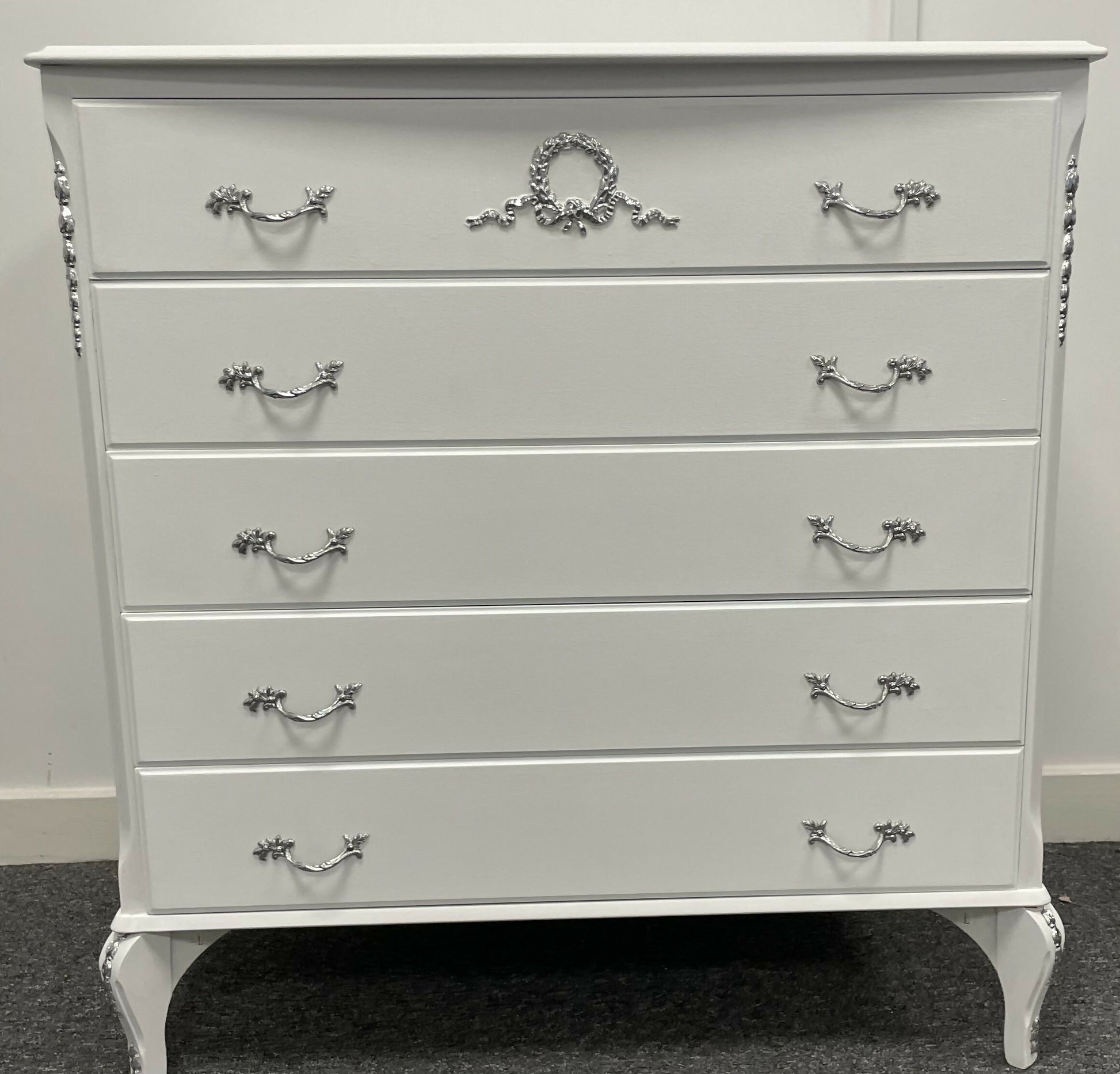 French Louis Style White and silver Chest of Drawers: Ornate 5-Drawer Dresser
