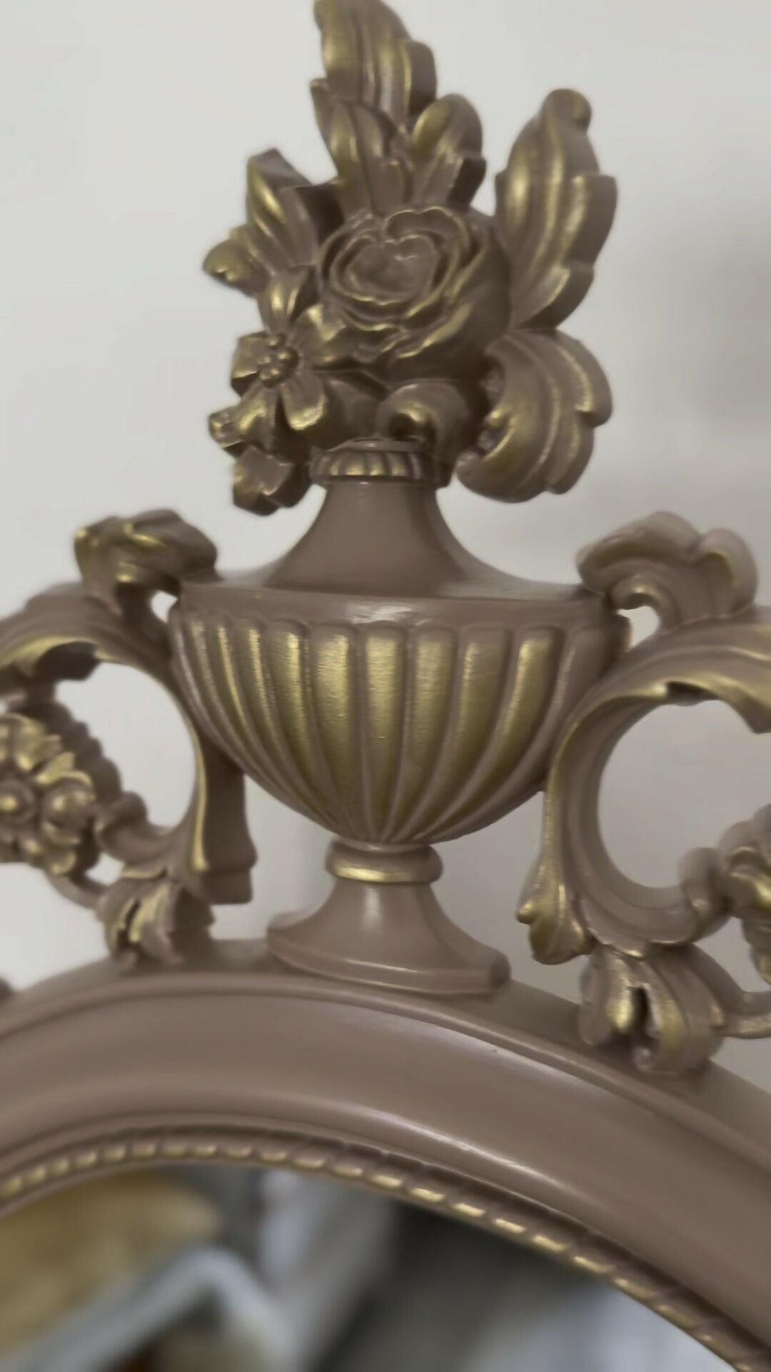 This elegant vanity features ornate carved detailing, graceful cabriole legs, and a stunning oval mirror with intricate scrollwork — all restored and refinished to perfection. The coordinated stool, reupholstered in a soft neutral fabric with brushed gold legs and stud detailing, completes the look with a touch of glamour.
