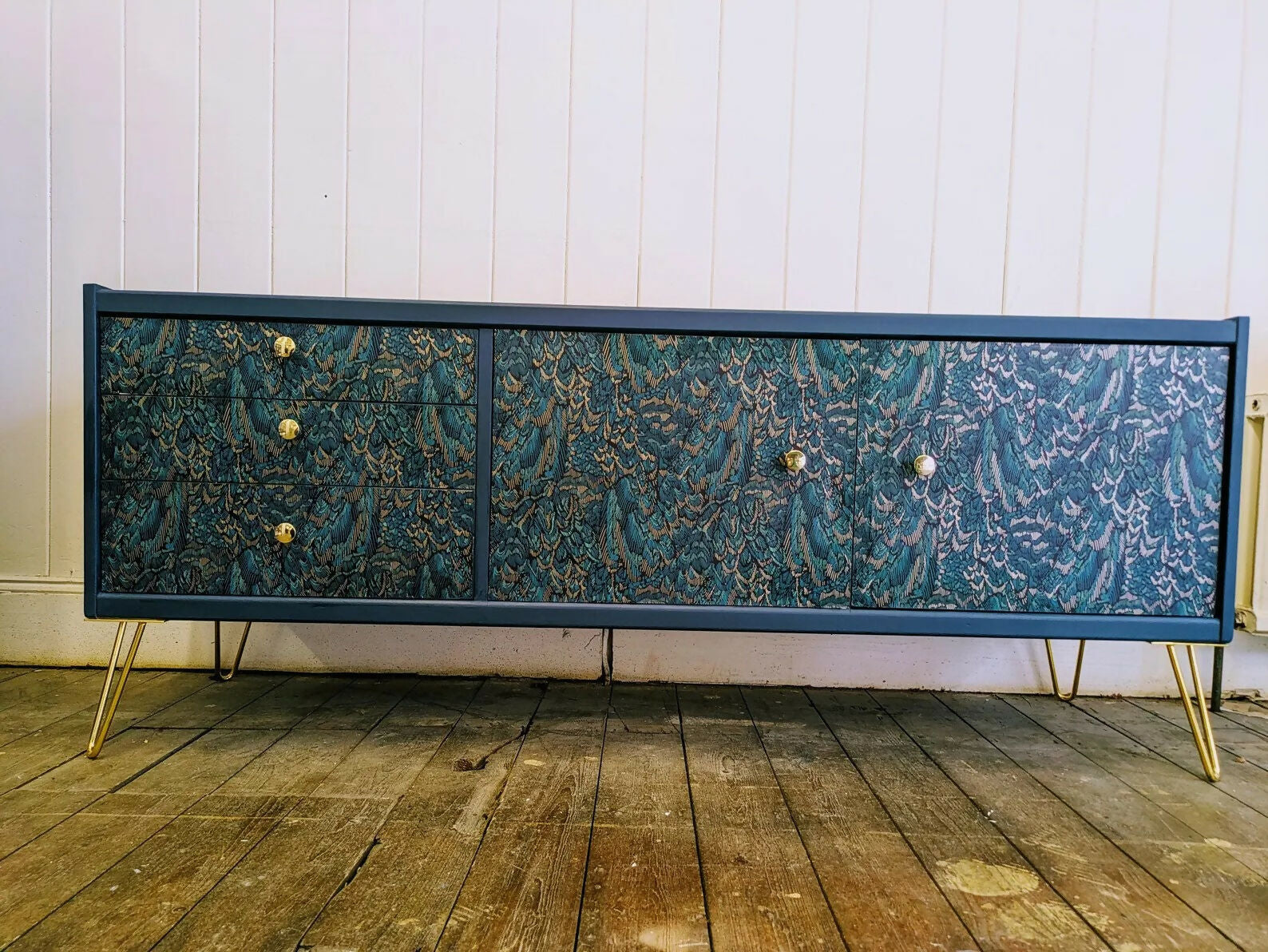 G Plan Midcentury Sideboard TV Unit Cocktail Cabinet. Upcycled Painted Blue,Teal Gold Living Room Furniture