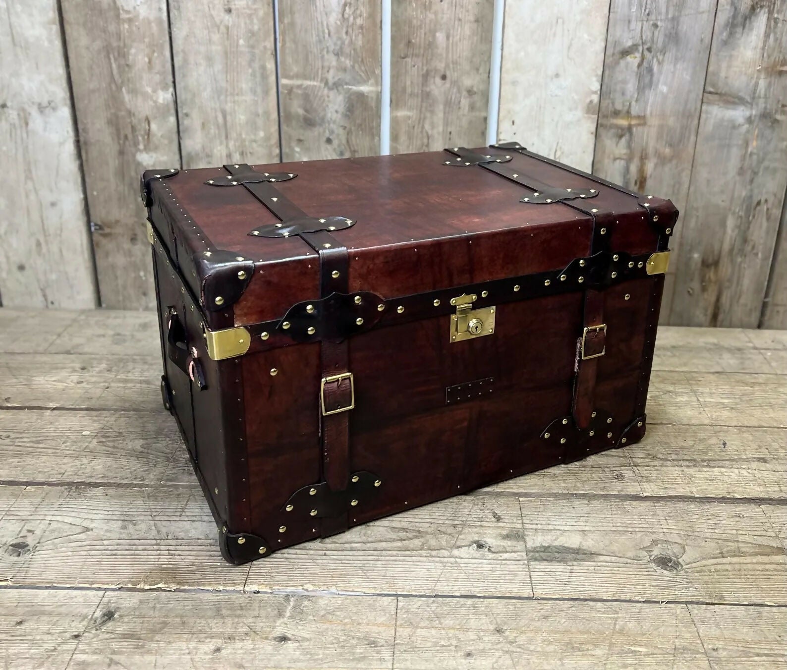 Genuine Bridle Leather Hand Dyed Belted Chestnut Brown Coffee Table Trunk