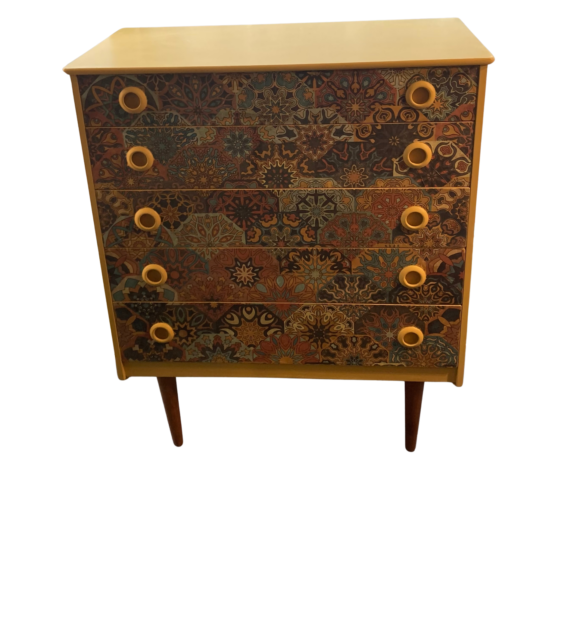 Each drawer front is beautifully covered in a handcrafted 70’s-inspired decoupage pattern, rich with bold floral and geometric motifs in warm oranges, deep blues, and earthy tones.