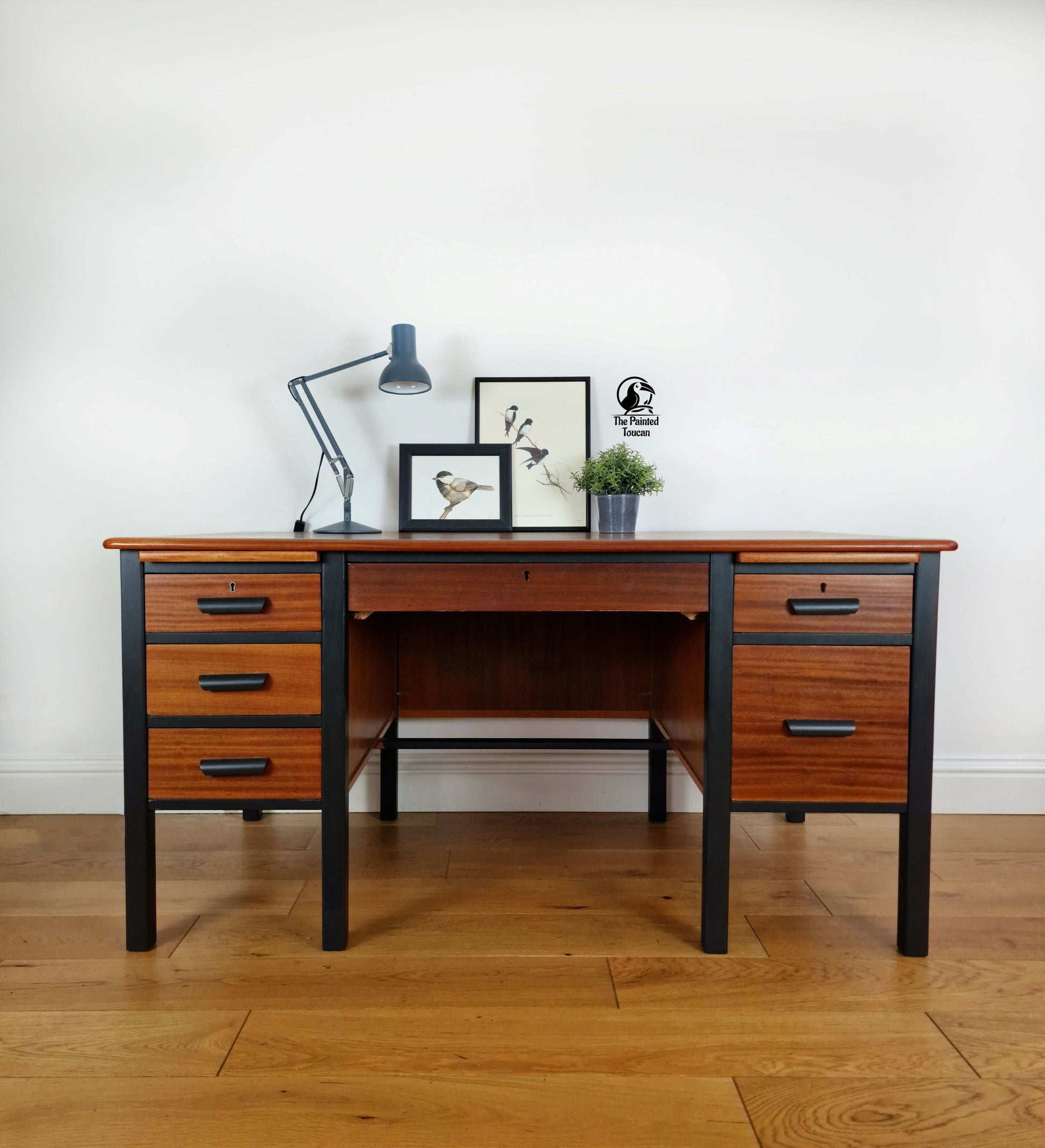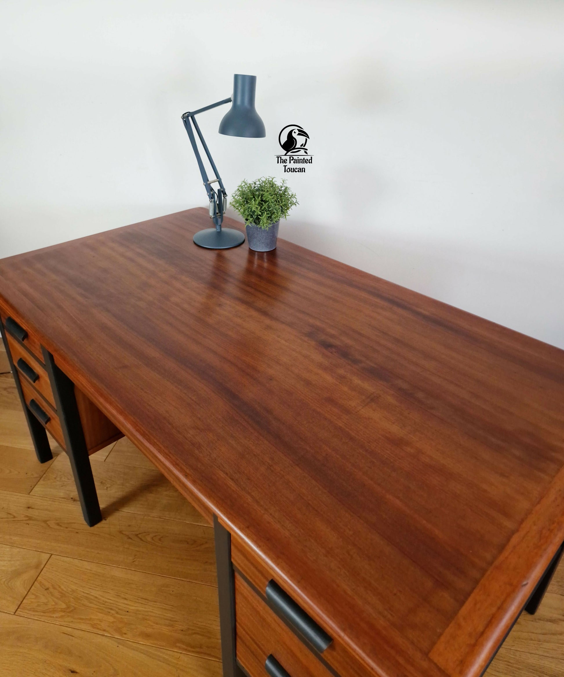 Made in the 1950s this large mid century twin pedestal rosewood office desk has been sympathetically restored and is ready for its new home! The main body and handles have been painted in Fusion's Ash grey and the drawers and top have been sanded and given a several coats of Osmo oil to bring out the beauty of the wood.