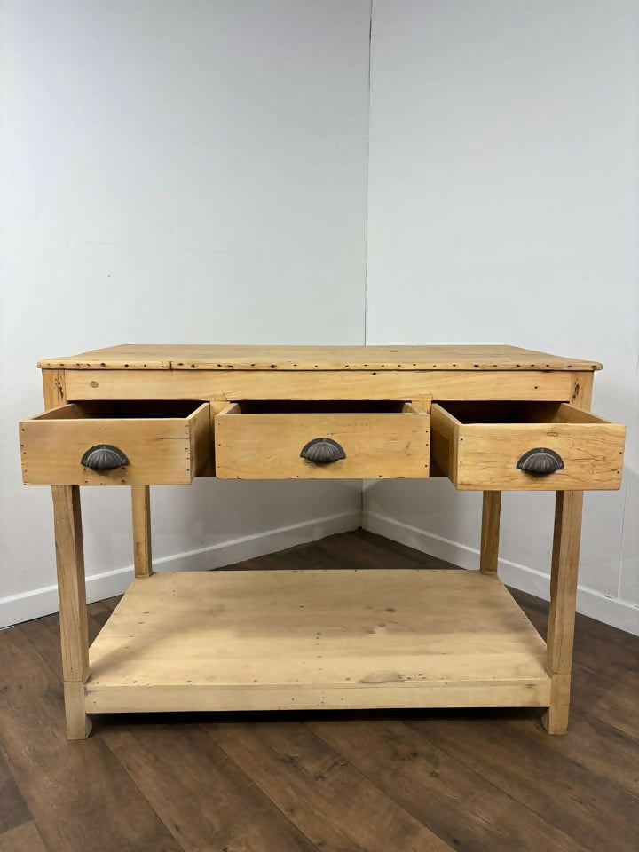 Fitted with three drawers to one side, each finished with decorative metal shell handles, offering useful storage for kitchen utensils or household items. Beneath the main section sits a full-width lower shelf, ideal for additional storage or display.